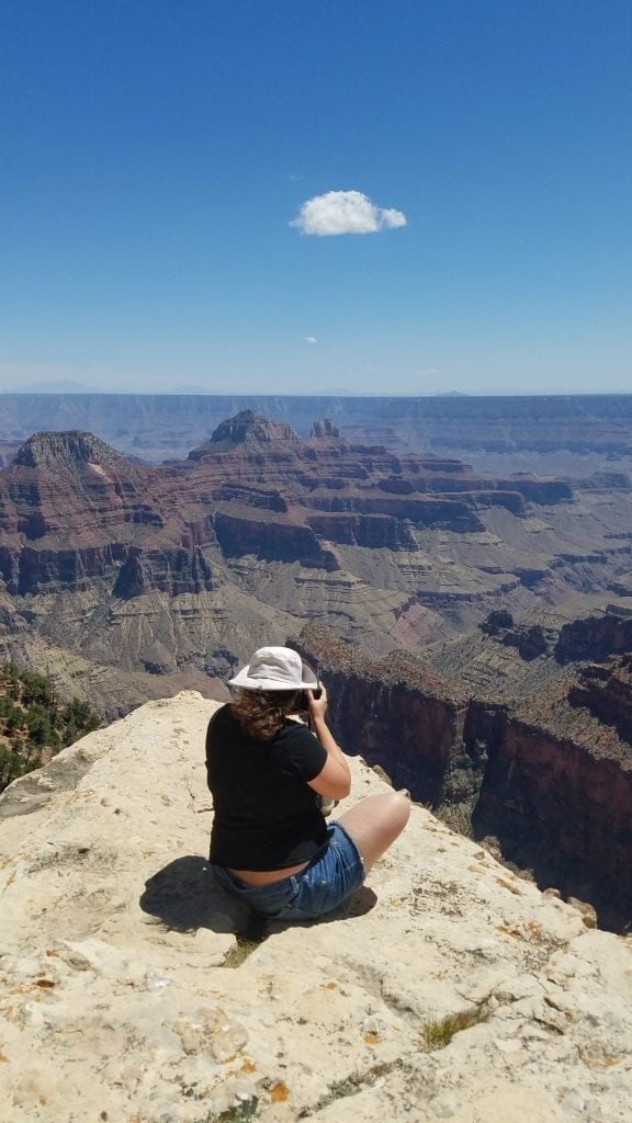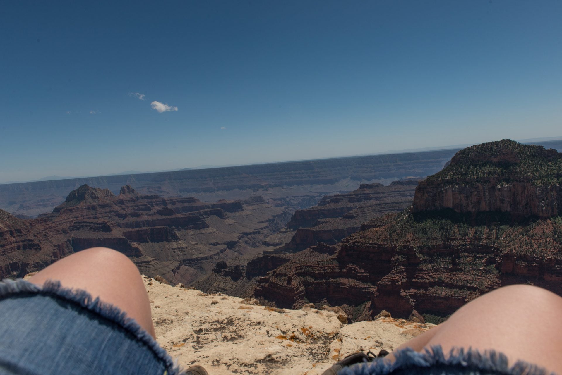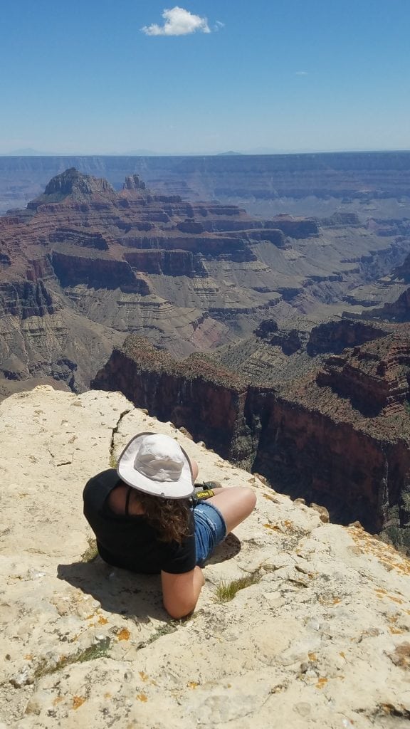This photo is me out on a cliff on North Rim Grand Canyon National Park. Suddenly it became very windy. I got down and laid on my back until it was calm. Snapped this photo.