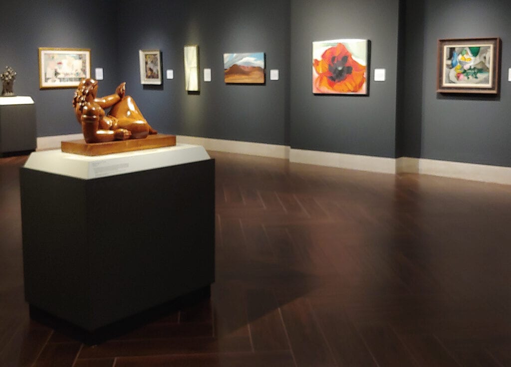 At the far end of this subdued gallery is a shining, glowing portal. So far we have been traveling on a chronological path through past centuries and now reach the brightly lit near-present. Left behind are recognizable images. The walls here are stark white so as not to detract from the color, line and form of the abstract works displayed.