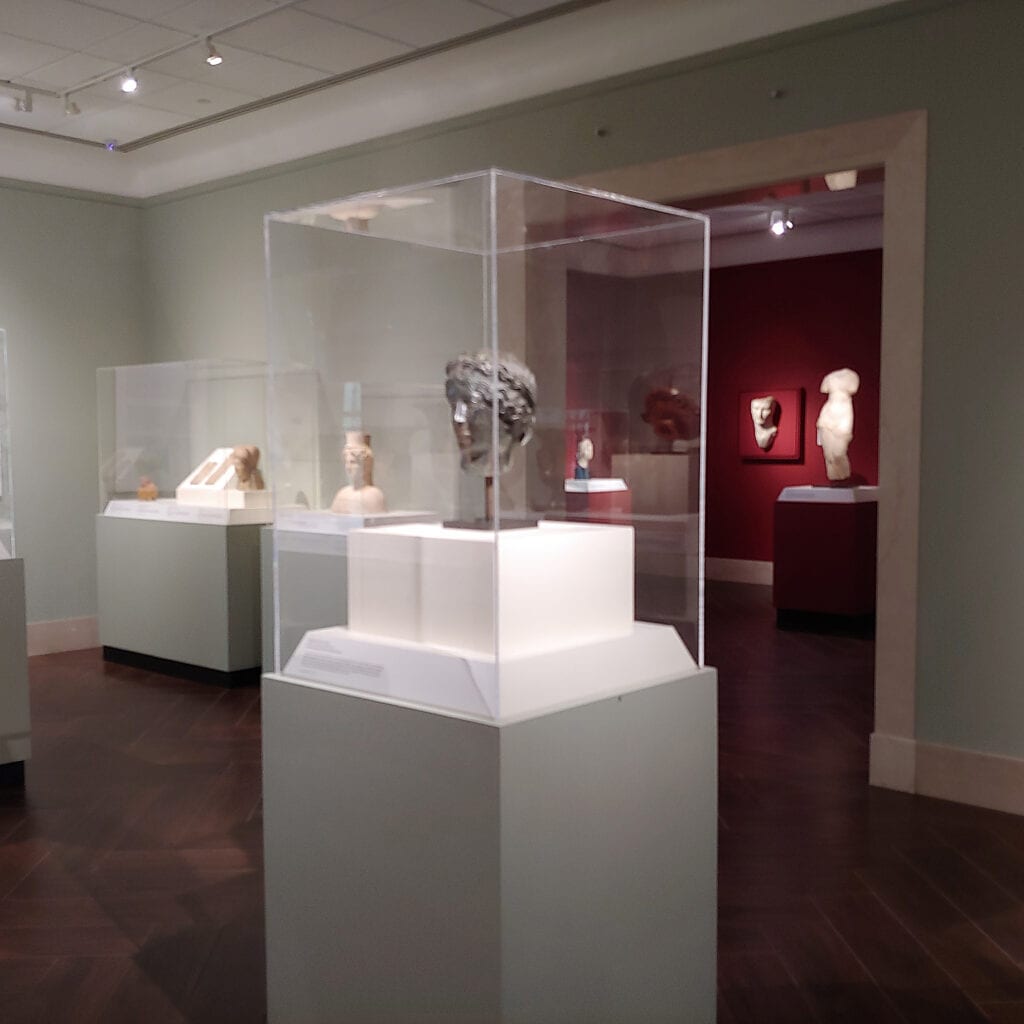 On the left we enter the Ancient Art offerings. Cool green walls offset selections from the sublime ancient Greek and Roman collection. The mood is chilly, but so would be the stone and bronze artifacts if we could touch or hold them. The clinical environment helps us examine the intricate works with a jeweler’s eye.