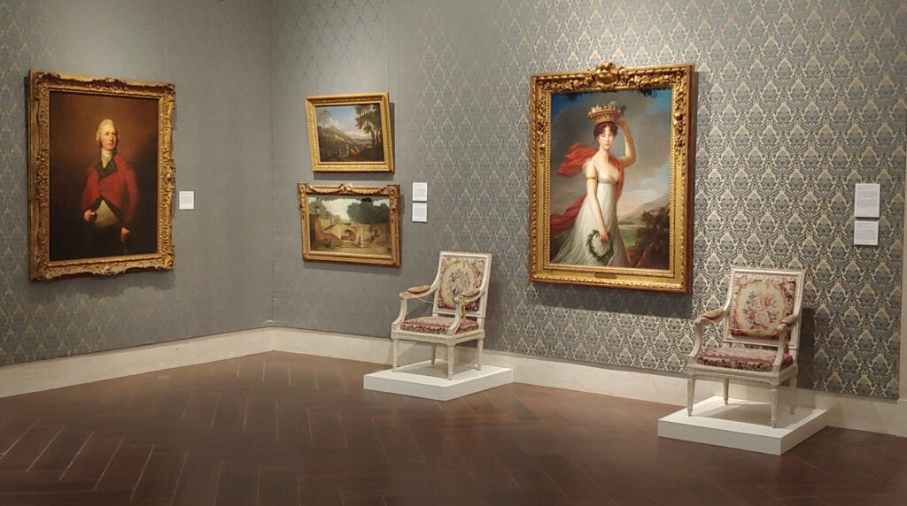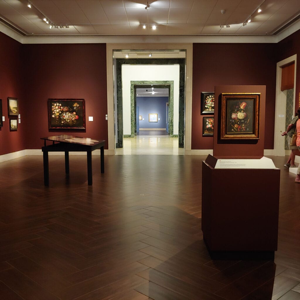 We enter the seemingly cavernous Baroque room. According to the museum, the walls are painted in Rookwood Dark Red which perfectly complements the lustrous (faux) wood plank flooring. The paintings feel right at home and so do we in a warm environment reminiscent of the inner sanctum of an opulent palazzo or villa.