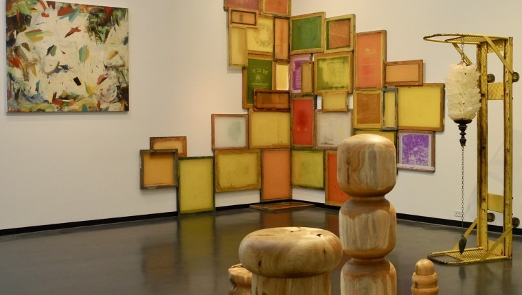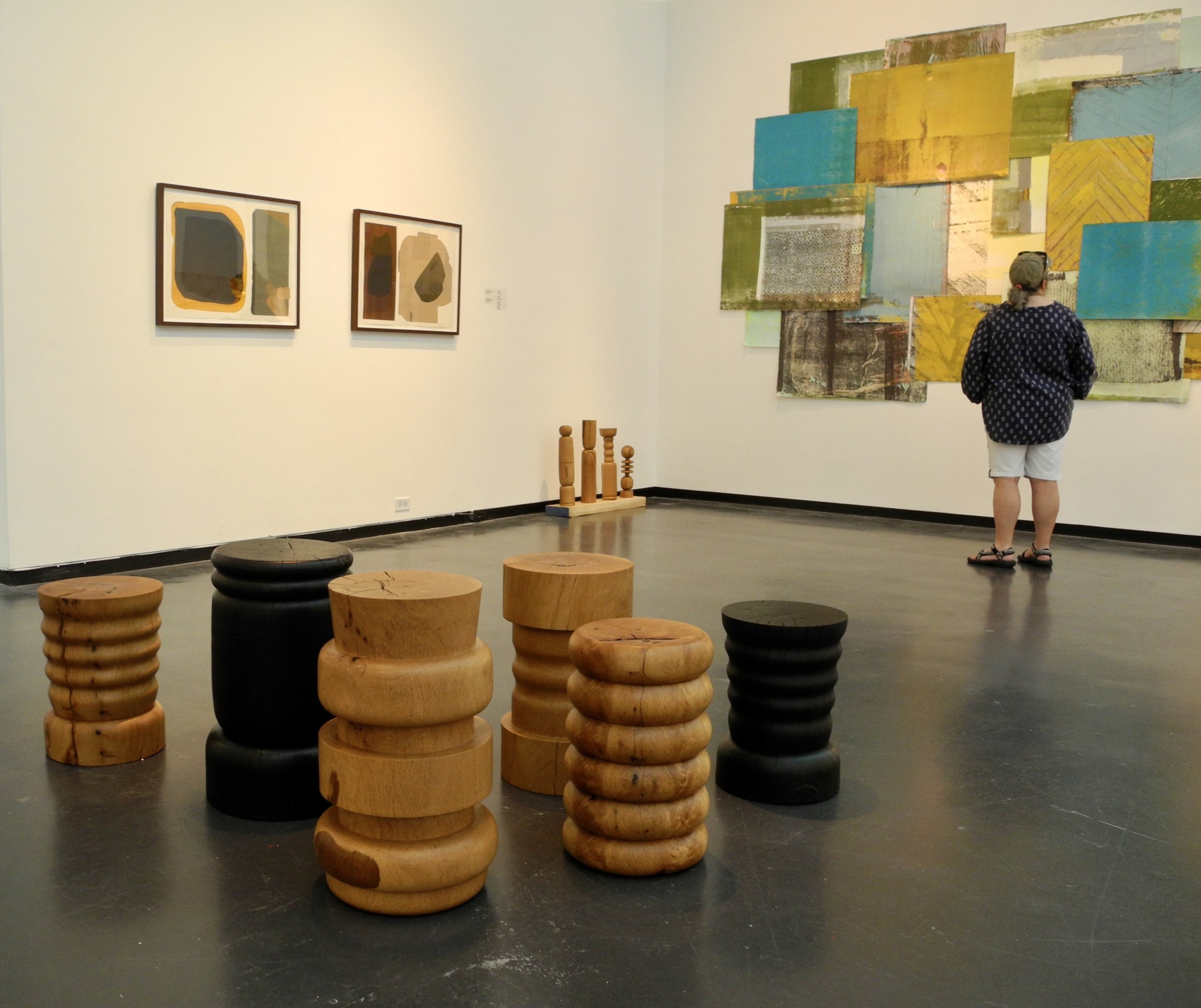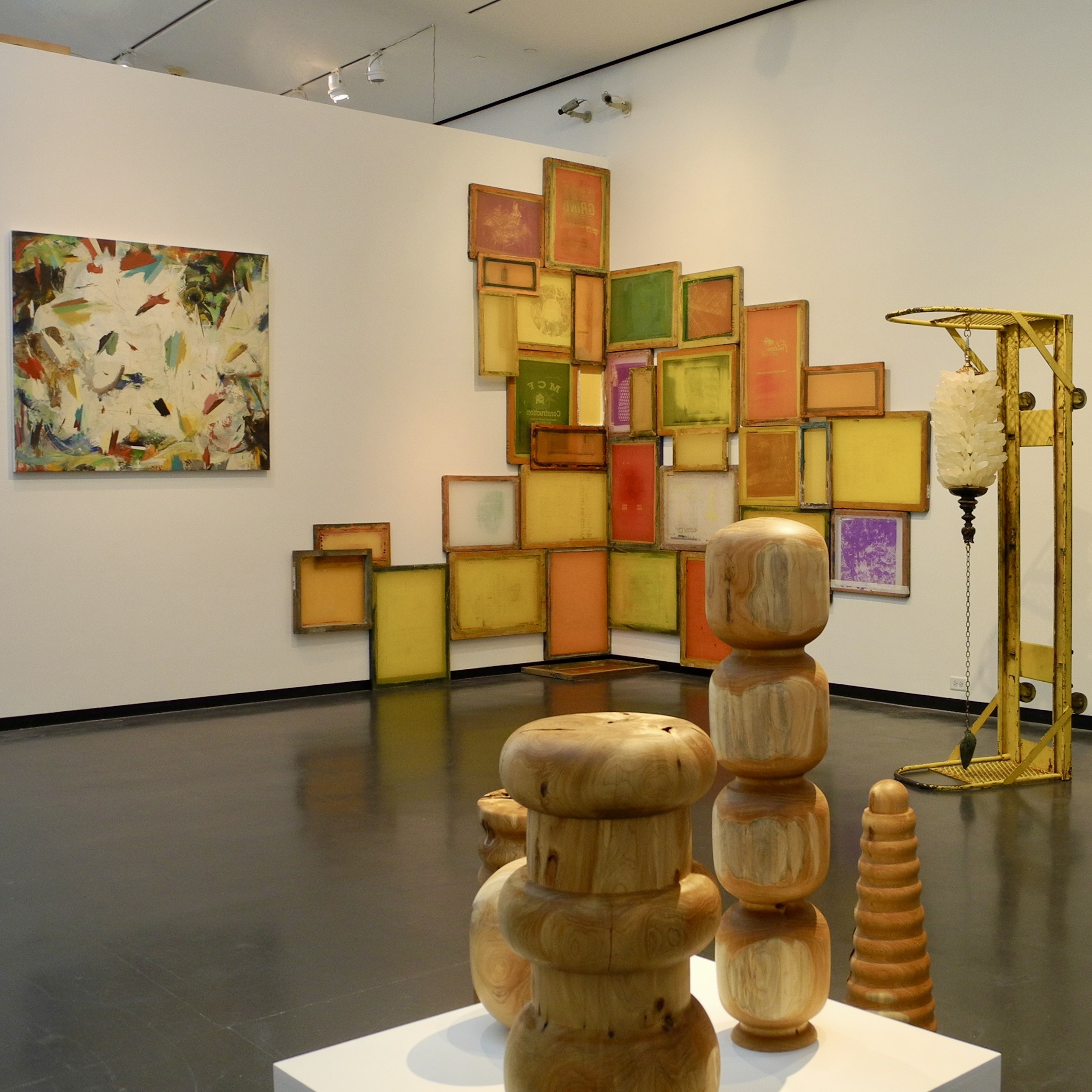 Wood pieces by Jib Projects, Kathleen and David Bly – partial view of wall installation of layered prints by Kendra Frorup – on left, two framed paintings by Edgar Sanchez Cumbas