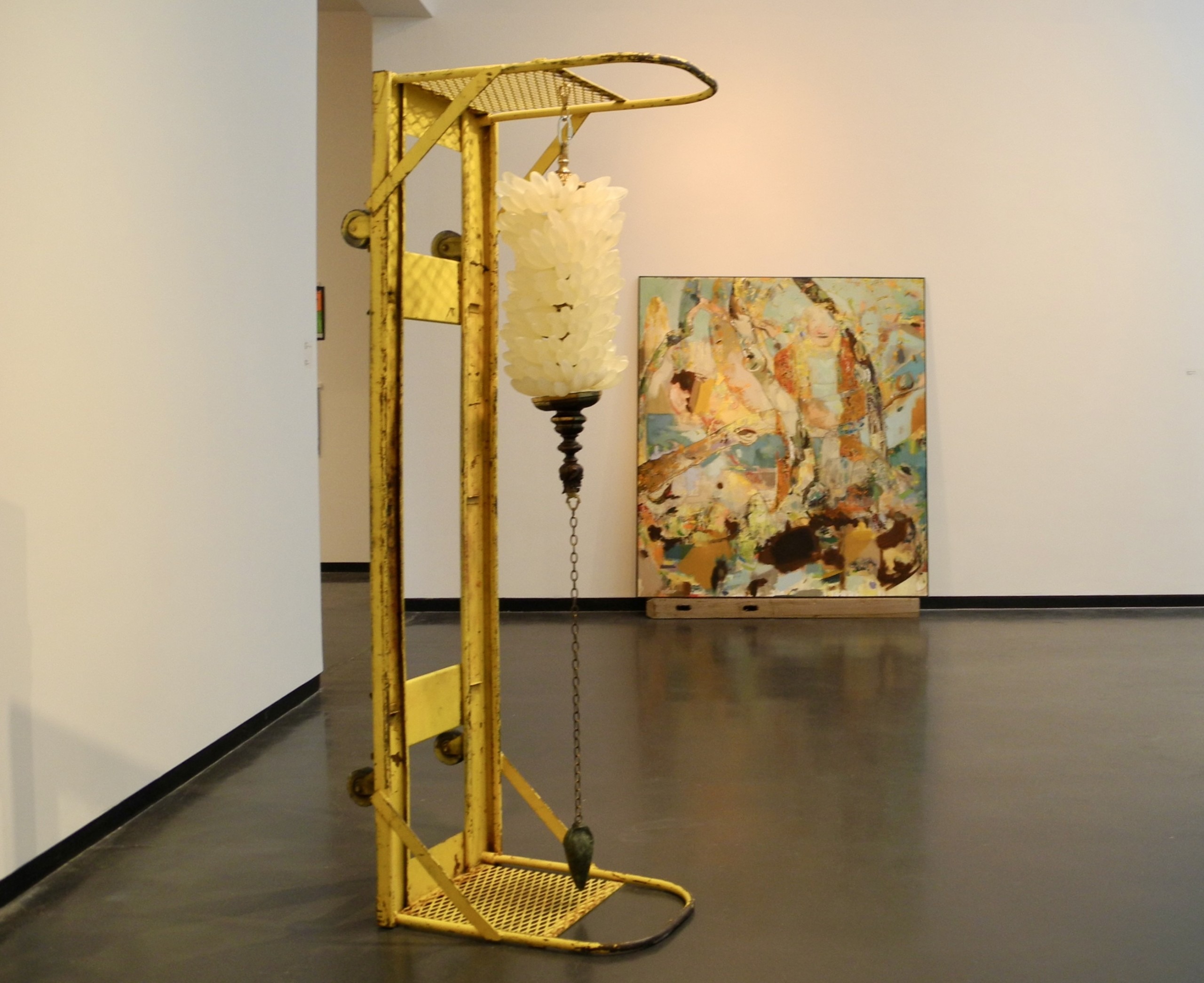 Painting by Edgar Sanchez Cumbas – wall installation of screen print screens and banana chandelier by Kendra Frorup – wood sculpture by Jib Projects, Kathleen and David Bly