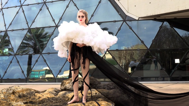 For example, one student used Mylar balloons in her design, another integrated hula hoops. Another student built a chicken wire structure to support a stole of puffy white fabric depicting a split cloud floating about the model’s shoulders. Students’ artist statements and sketches can be seen on The Dalí website.