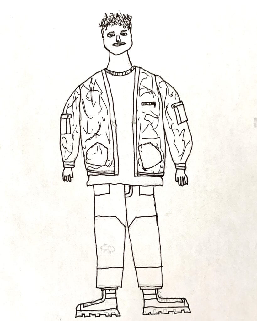 Design by Elijah Ulrich, Largo High, Grade 12. “I want to make an outfit centered around a type of garment which I have never seen before; a floral print denim kimono varsity cargo jacket.”