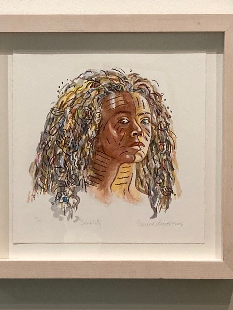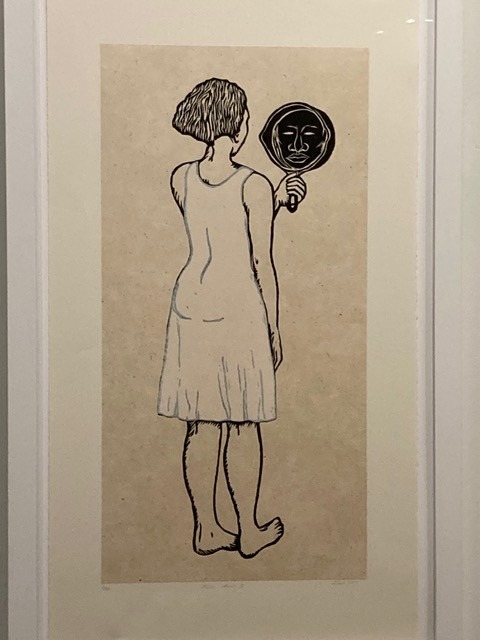 According to the exhibit’s brochure, “the complexity of personal identity is addressed in the works of Alison Saar and Emma Amos, who use self-portraits to consider their relationship to the African diaspora.”