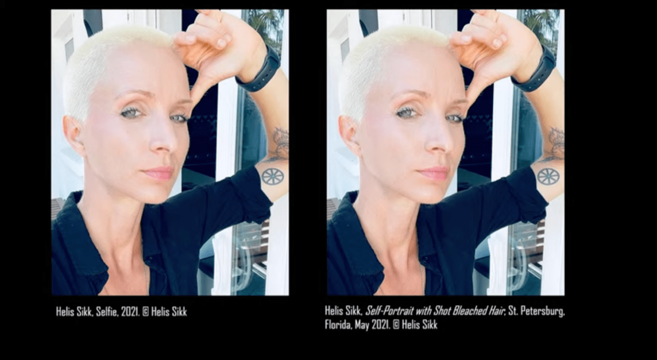 To illustrate the close kinship between the self-portrait and the selfie, Sikk — in her talk at the Dalí — showed a slide of two images of herself side by side. The left one was marked Selfie. The right one labeled Self-Portrait With Shot Bleached Hair.