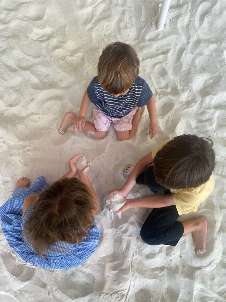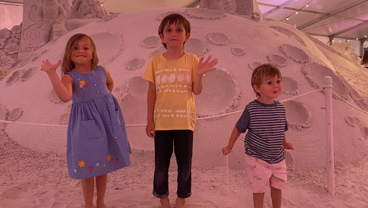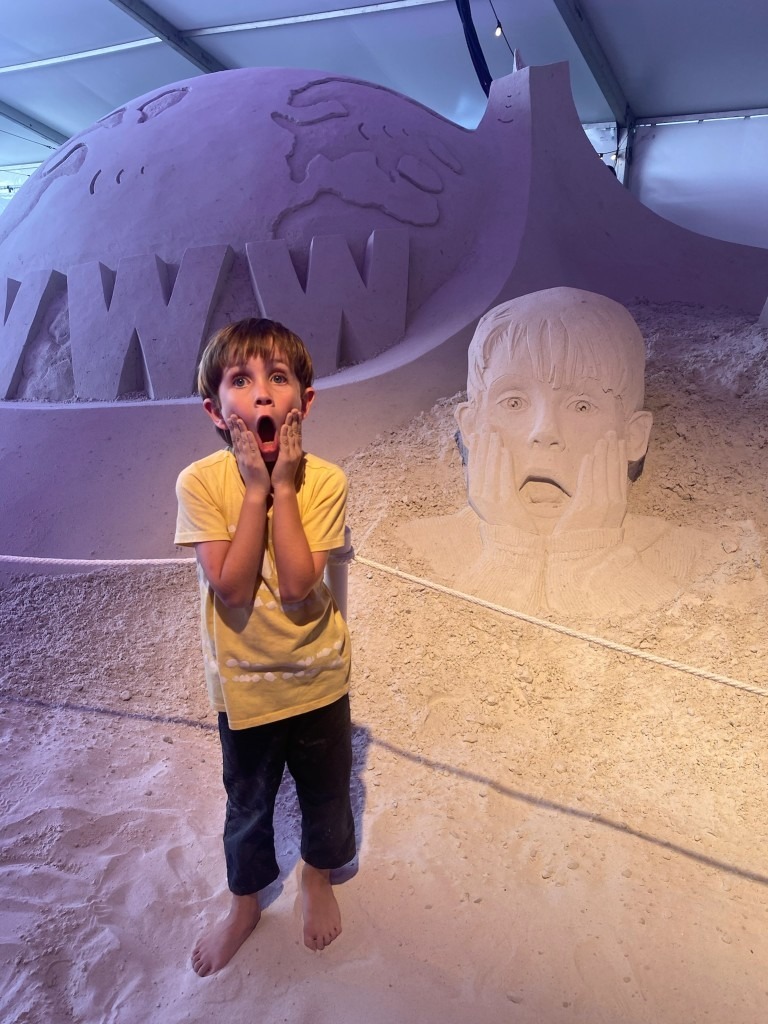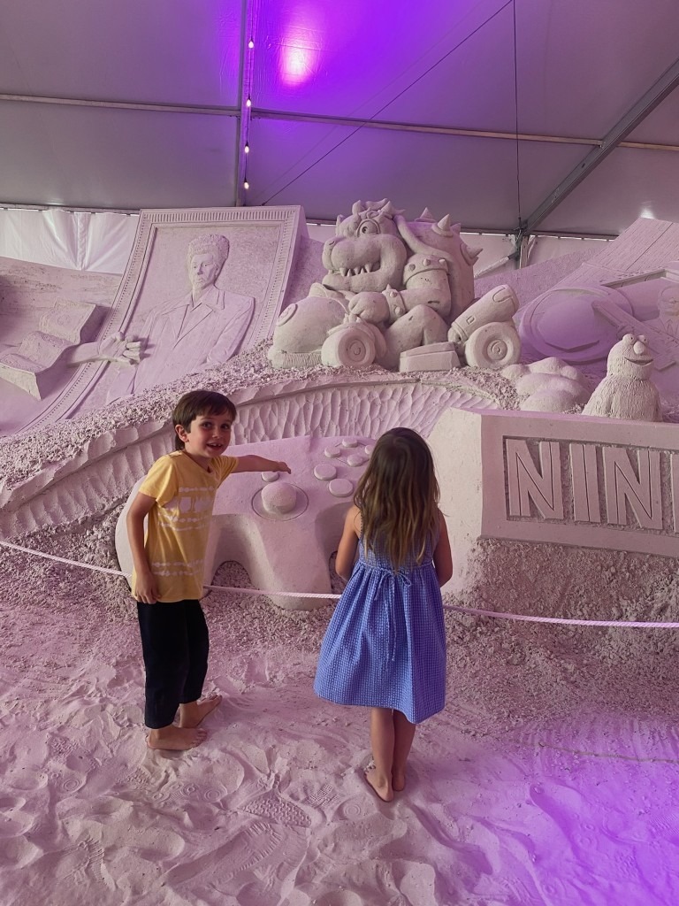 Many of the sculptures stirred memories for me and my husband, and even though the trip down memory lane was just out of reach for the kids (especially the youngest Thomas) they still had a blast. As we were walking through the exhibit, all three were on the floor making sand angels and pouring the silky smooth white sand through their fingers.