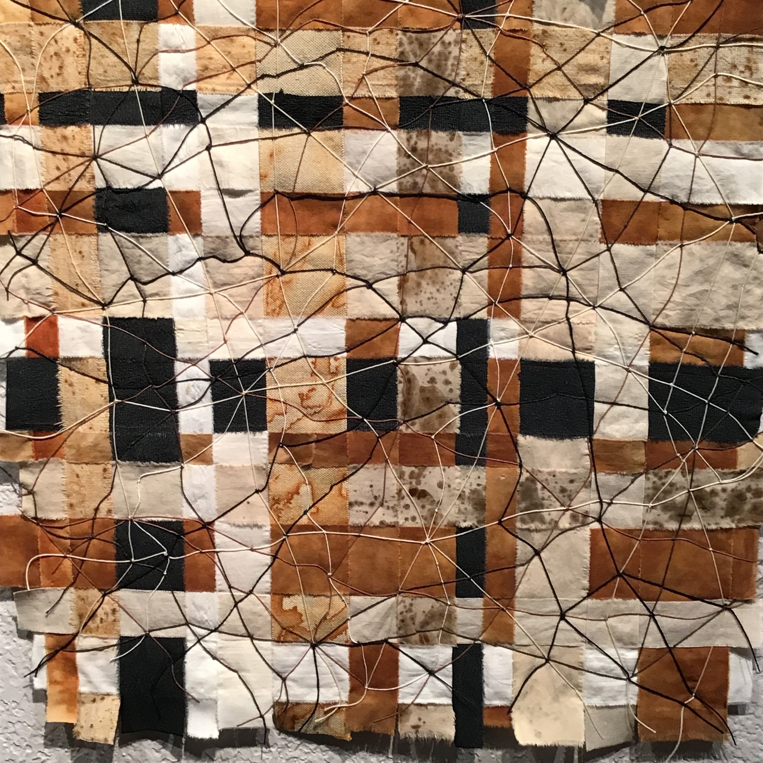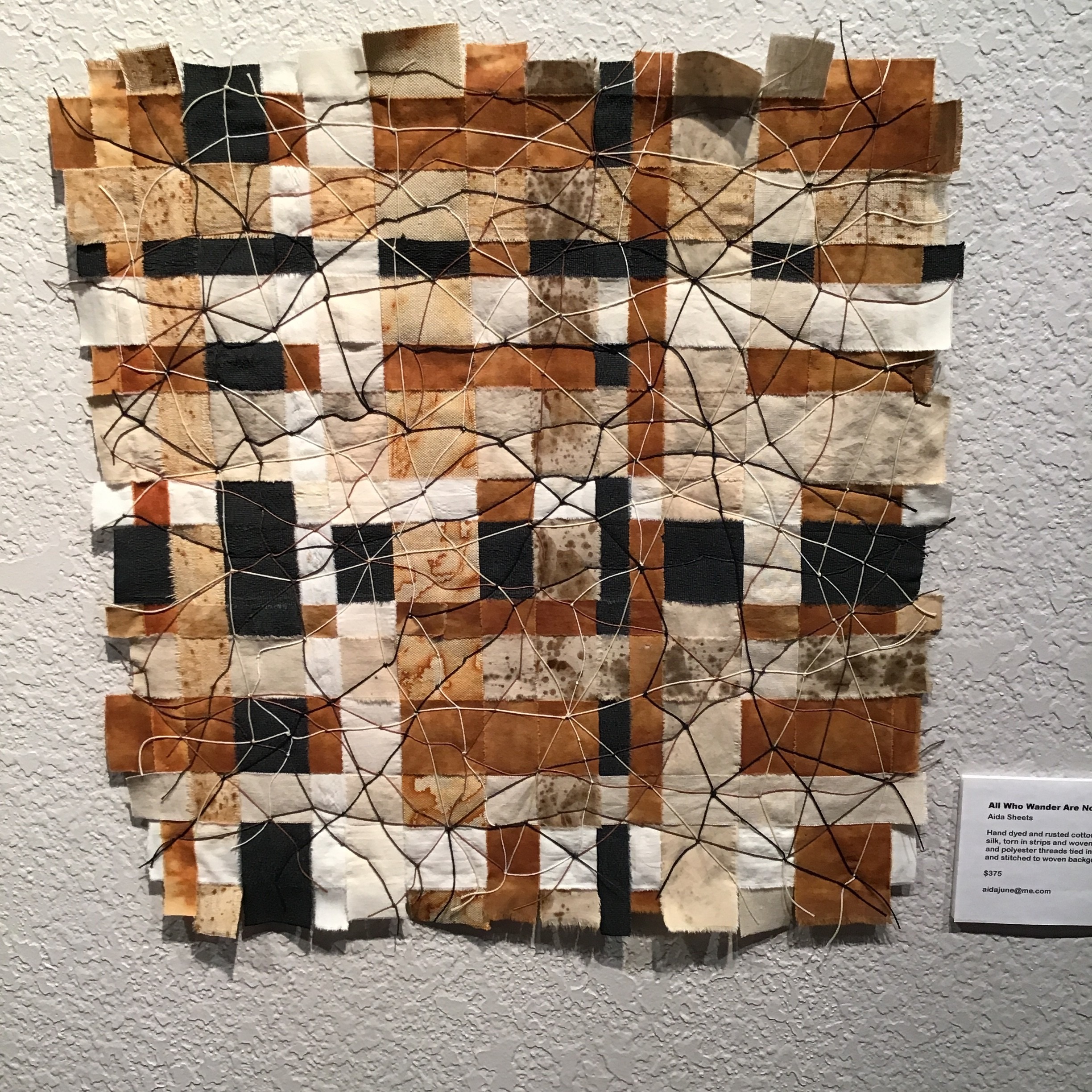 Aida Sheets hand-dyed and rusted cotton fabrics, took kimono silk, cut all into strips, and then wove them together. Thread was placed randomly on the woven piece and then stitched for All Who Wander are Not Lost.