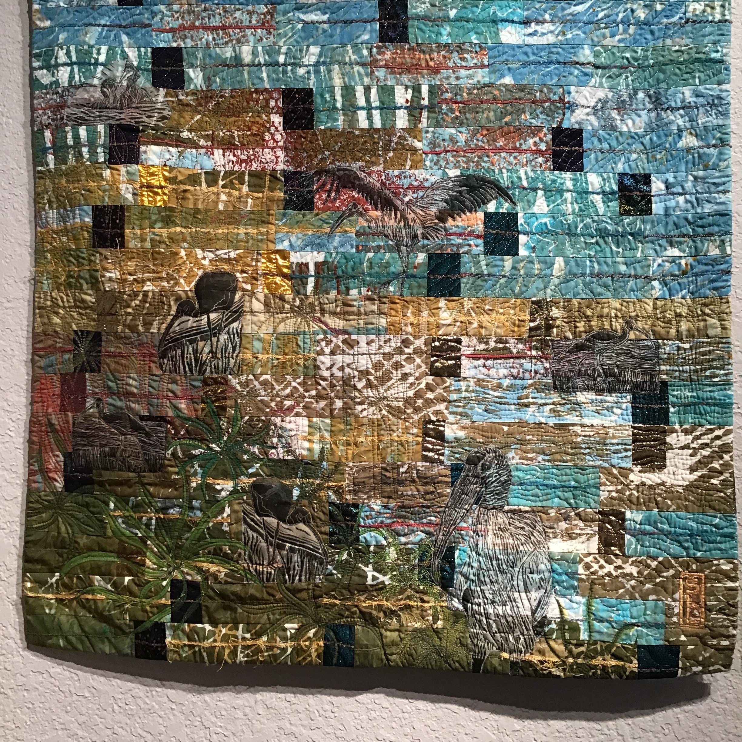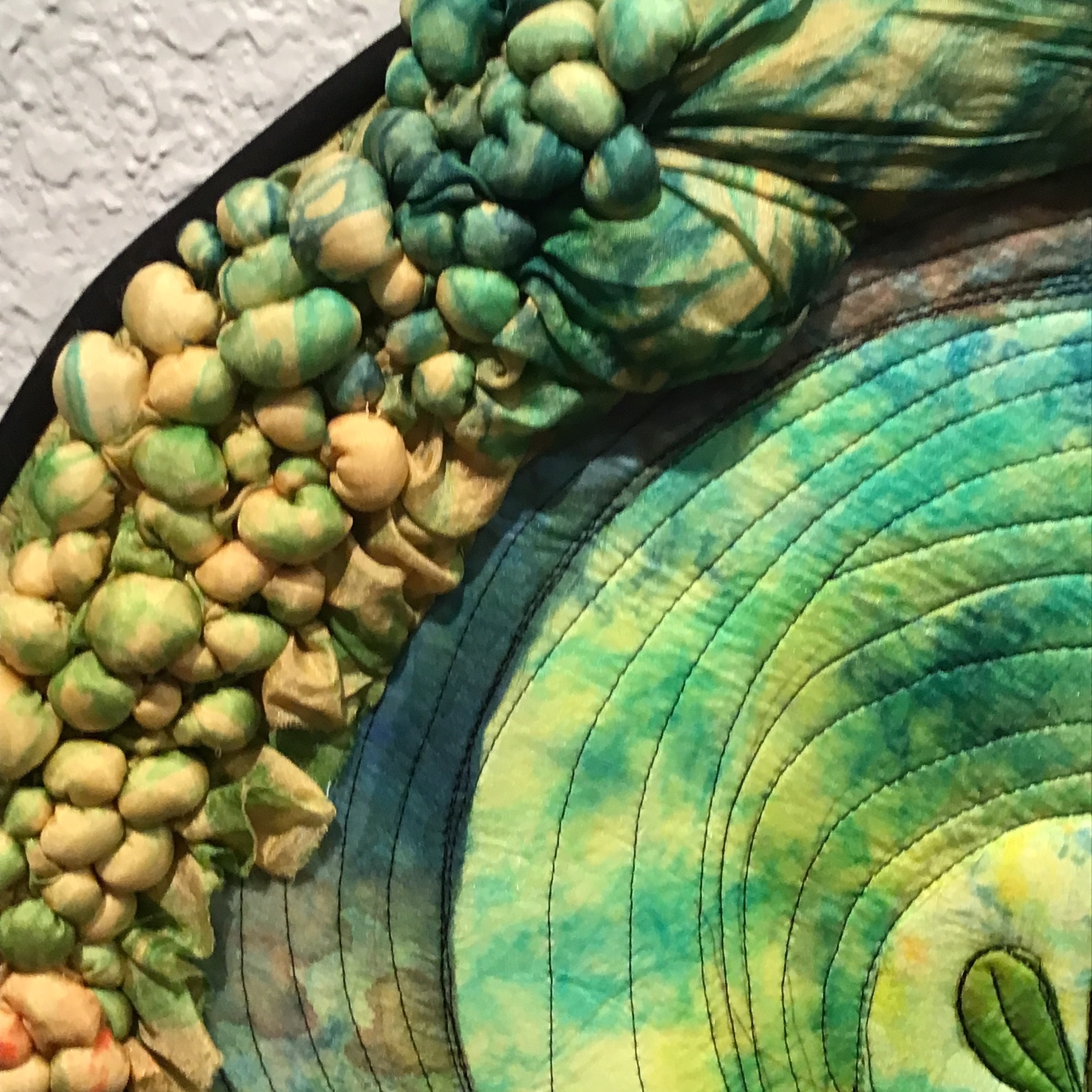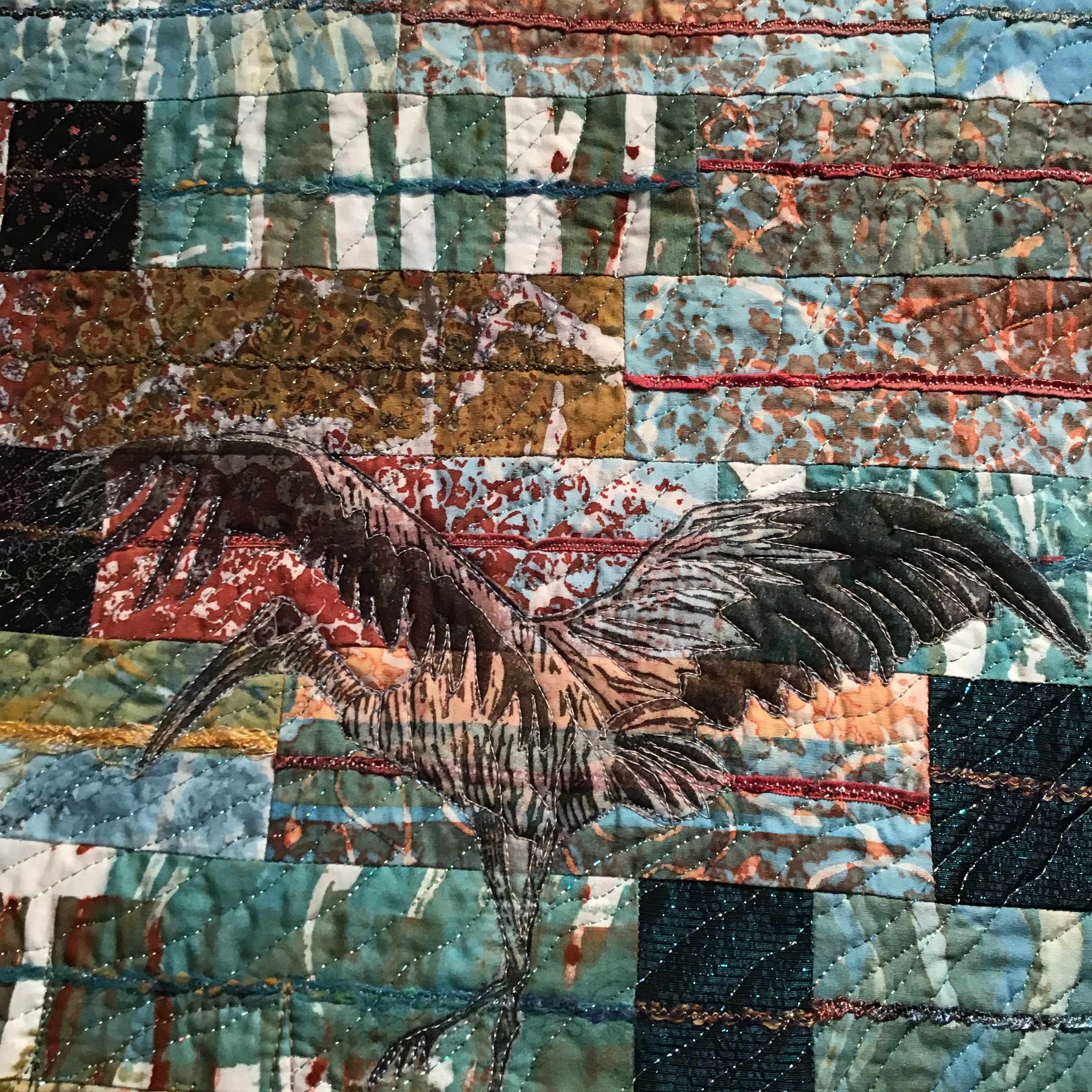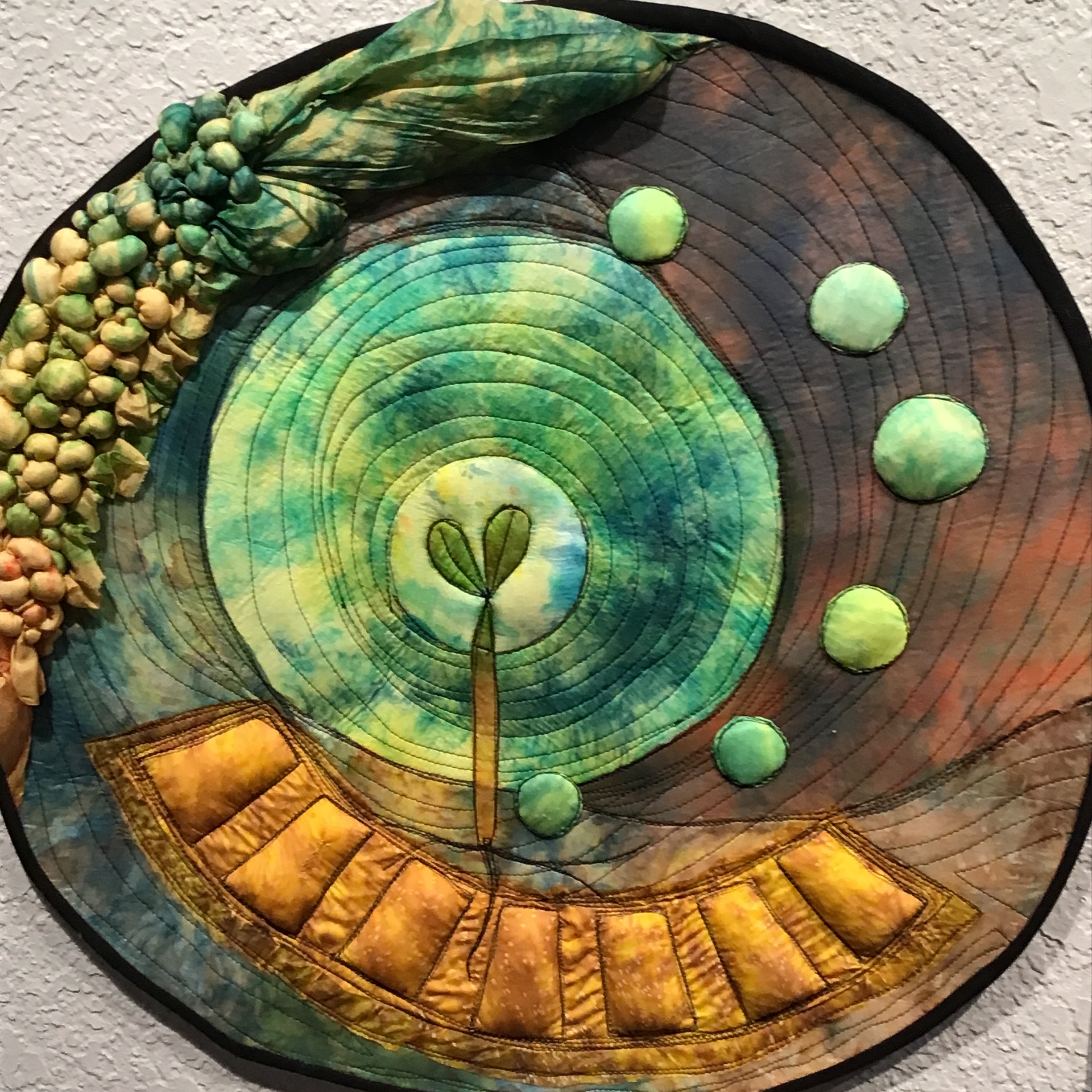 Mary Ann Pickard printed photos on cotton and machine quilted shibori and commercial batik fabrics and embellished her piece with white organza and blue jay feathers. Her piece depicts an “amazing” shelf fungus that came to grow “on a tree stump to take it back to the earth and nourish the new tree” (a tree Pickard planted).