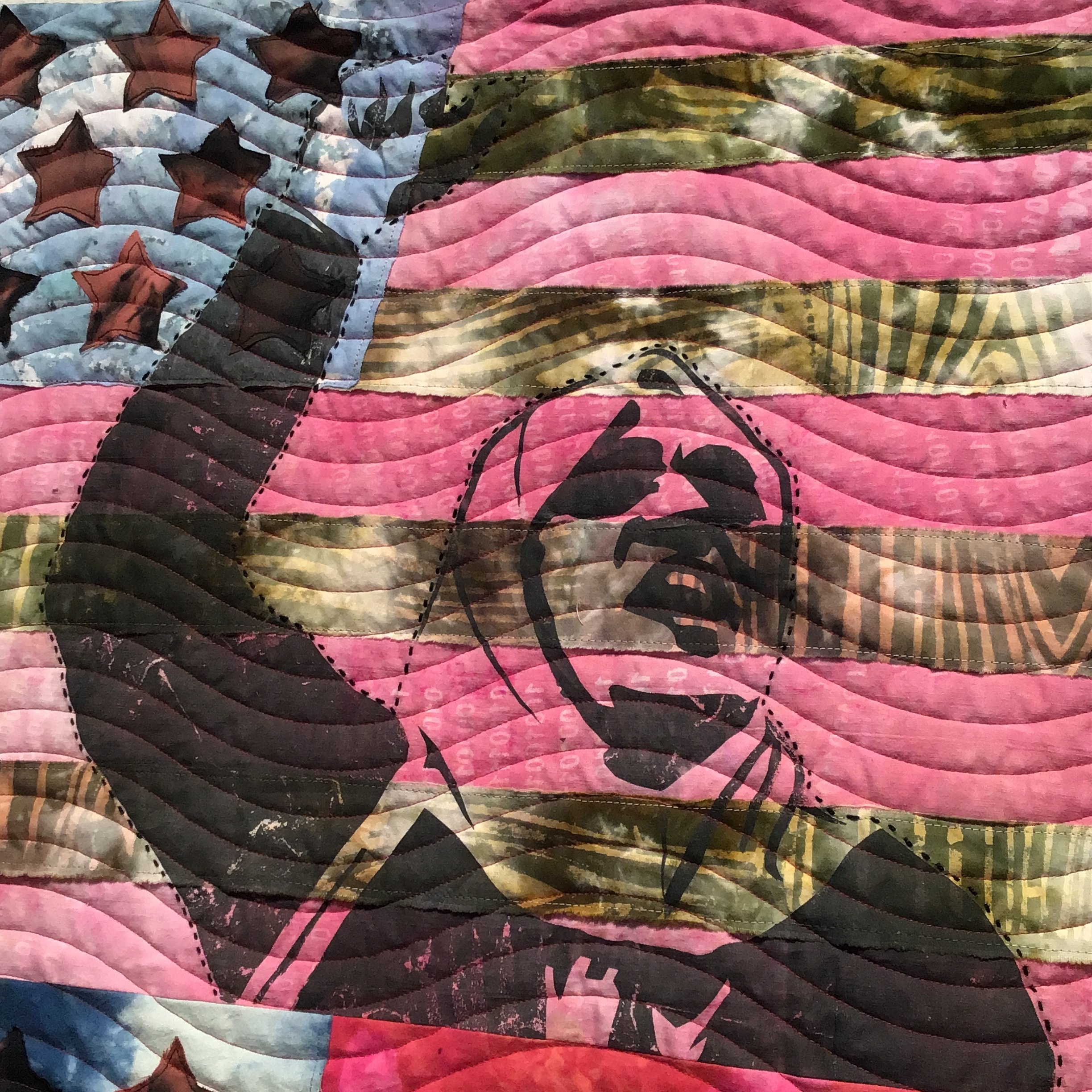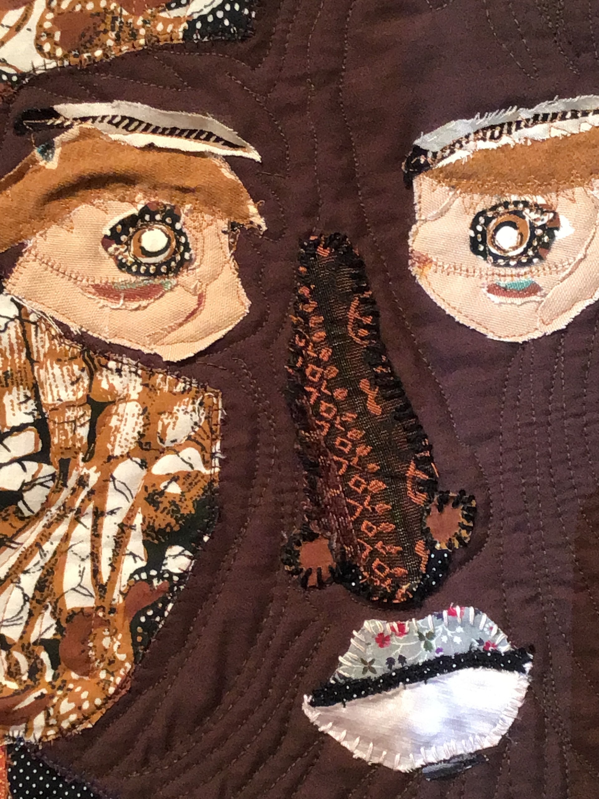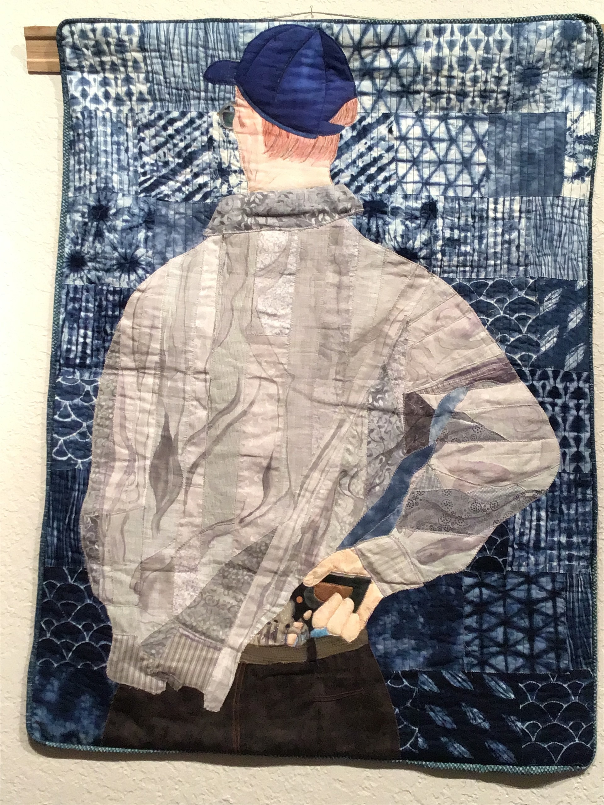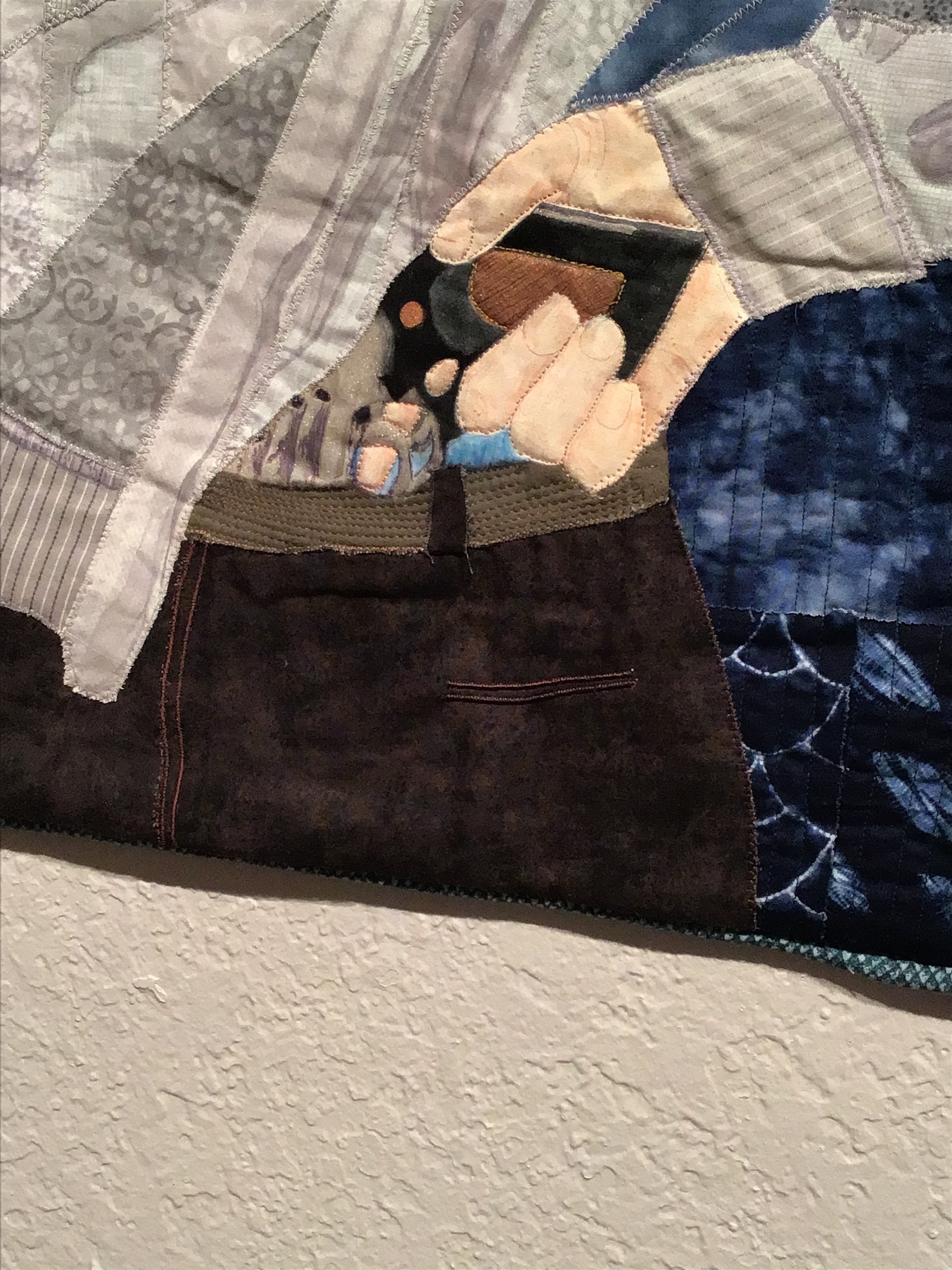 Mary Ann Pickard printed photos on cotton and machine quilted shibori and commercial batik fabrics and embellished her piece with white organza and blue jay feathers. Her piece depicts an “amazing” shelf fungus that came to grow “on a tree stump to take it back to the earth and nourish the new tree” (a tree Pickard planted).