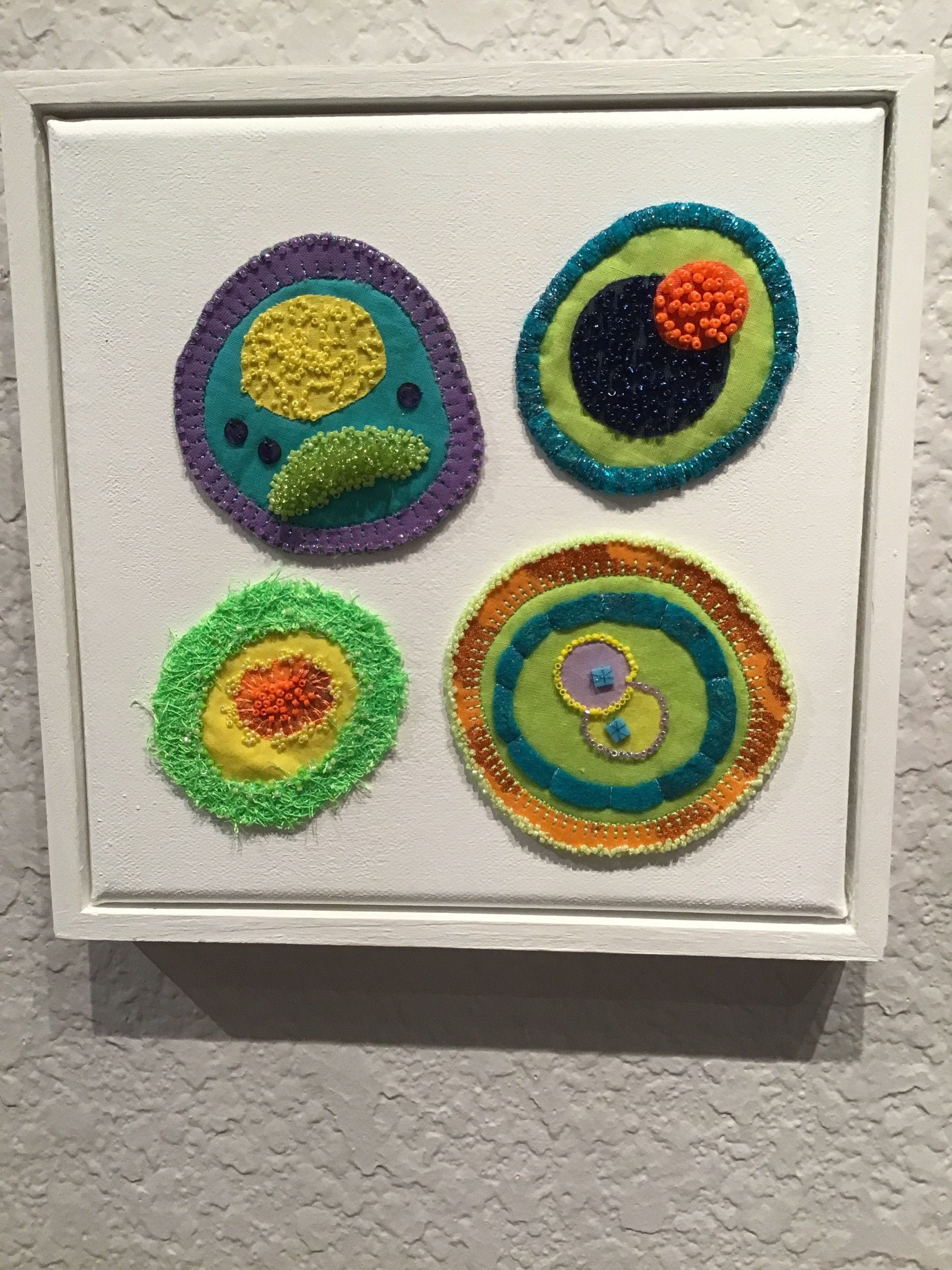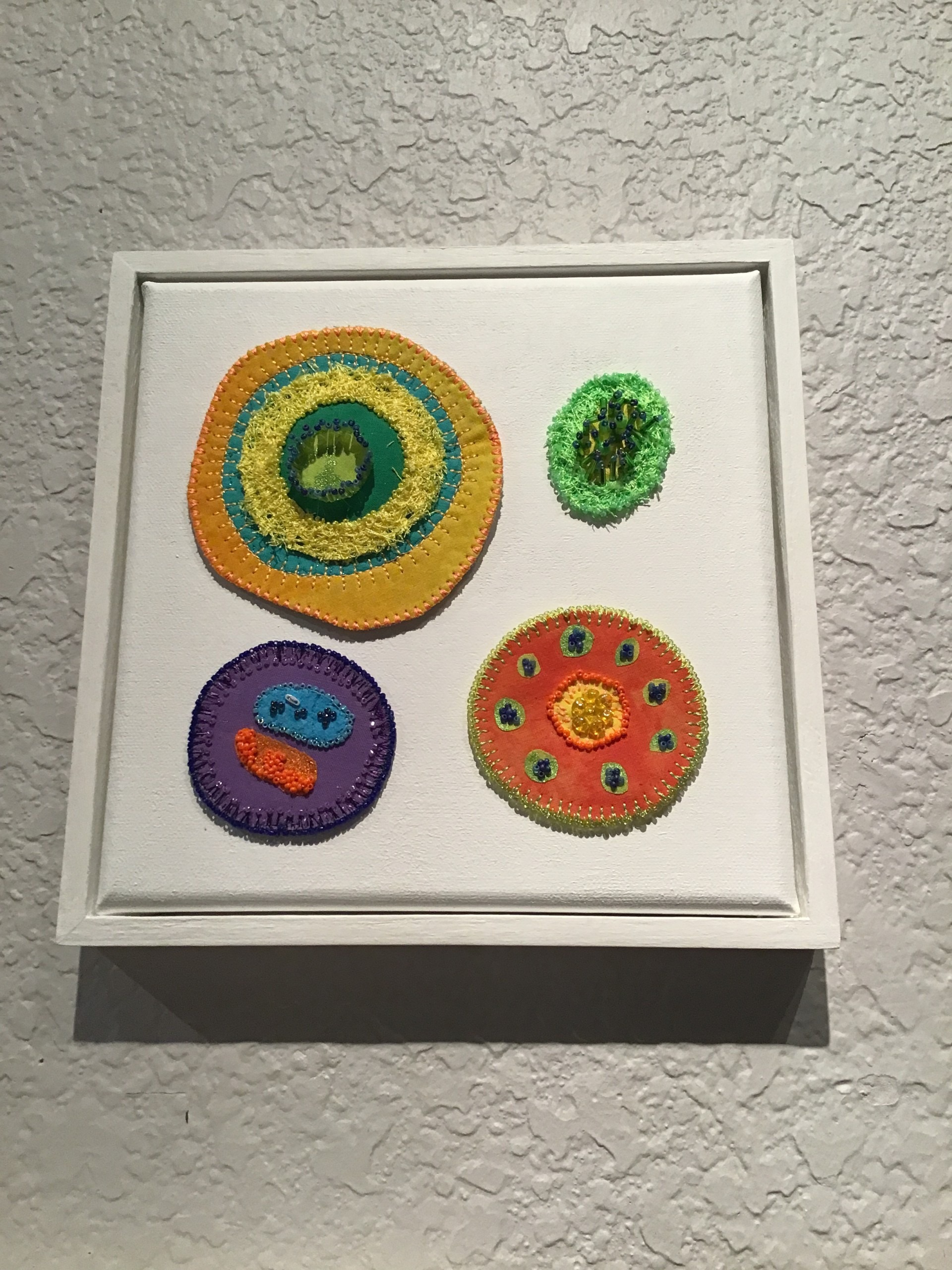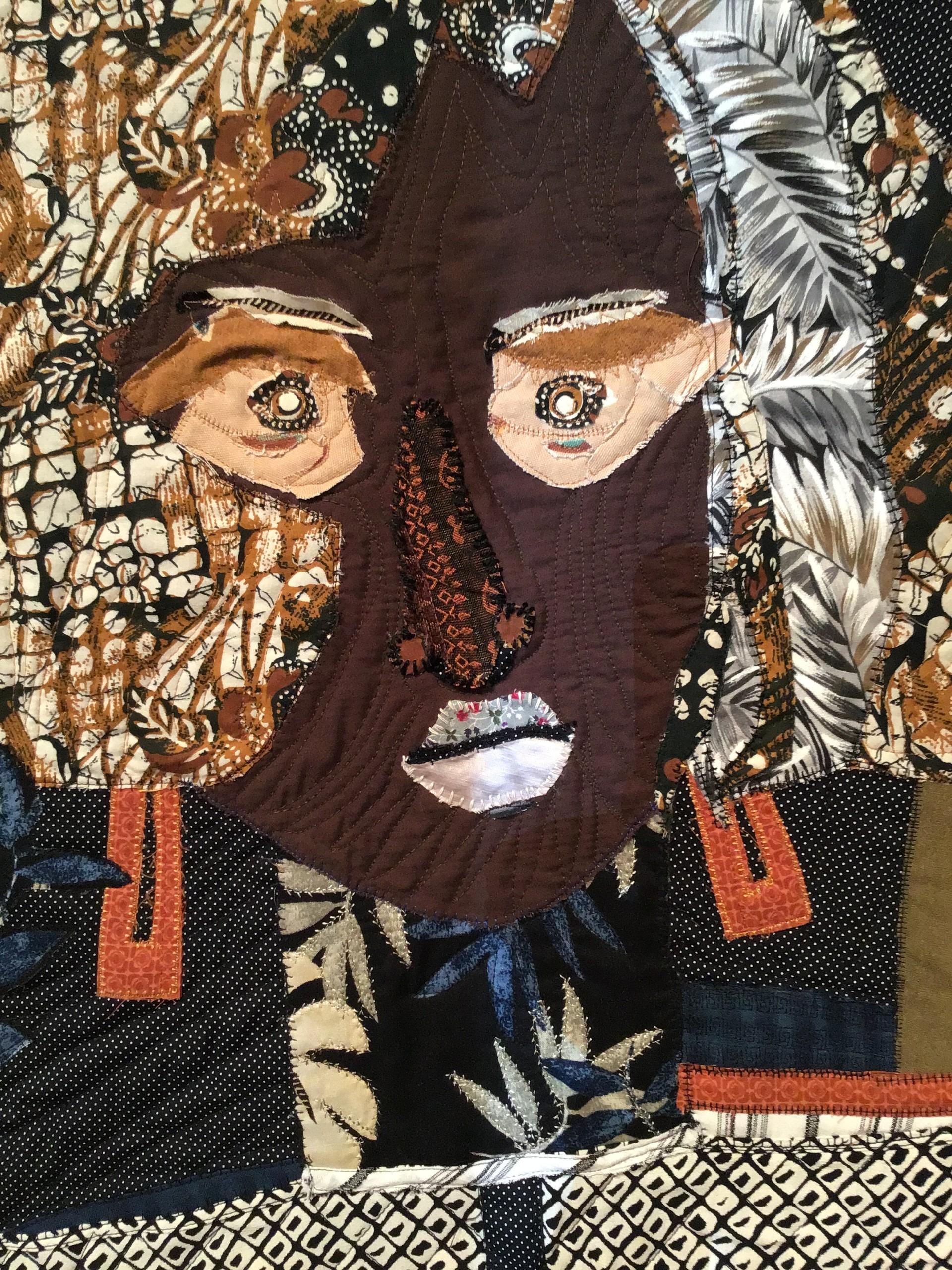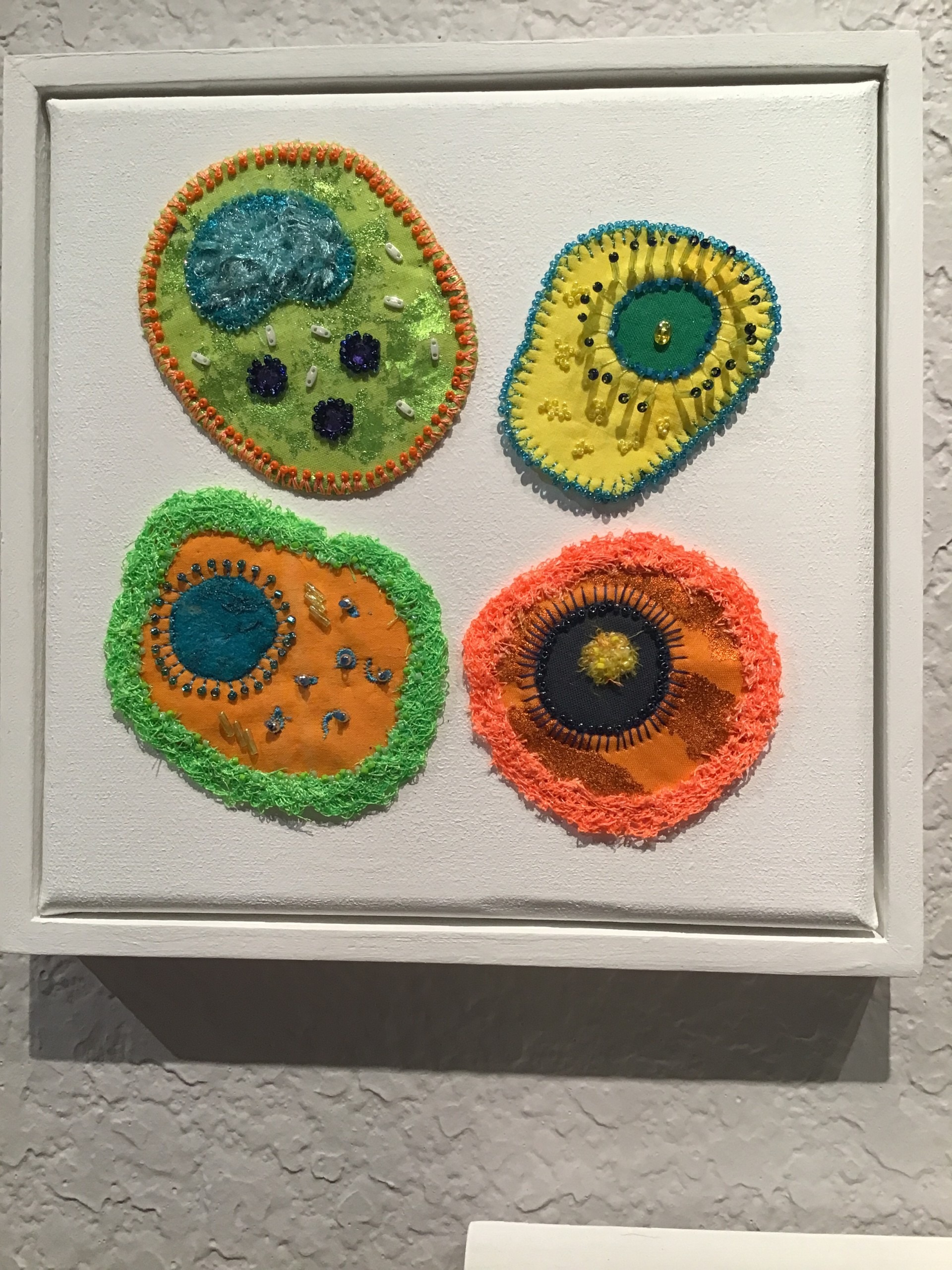 Mary Ann Pickard printed photos on cotton and machine quilted shibori and commercial batik fabrics and embellished her piece with white organza and blue jay feathers. Her piece depicts an “amazing” shelf fungus that came to grow “on a tree stump to take it back to the earth and nourish the new tree” (a tree Pickard planted).