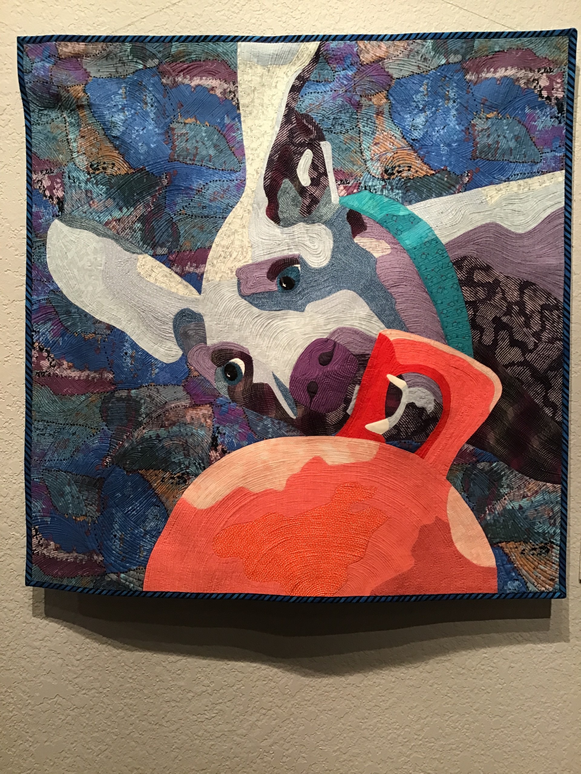 My favorite fiber art piece is Pauline Salzman’s Ball Girl, an attention-grabbing fabric image of a puppy at play. I don’t have a dog but this appliquéd cotton machine-stitched quilt was so lively and expressive, I fell in love with her.