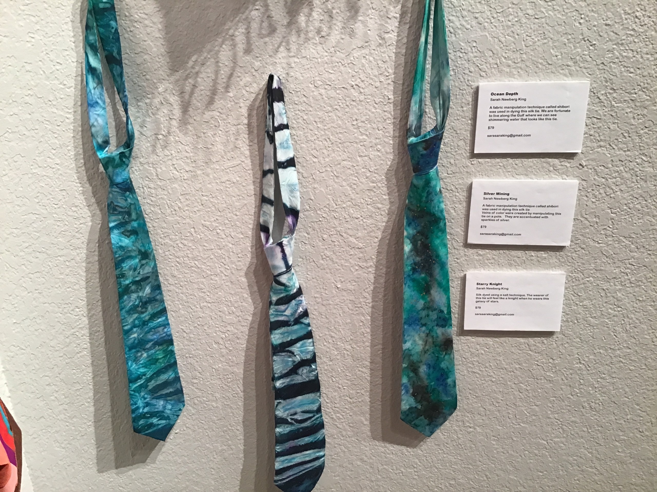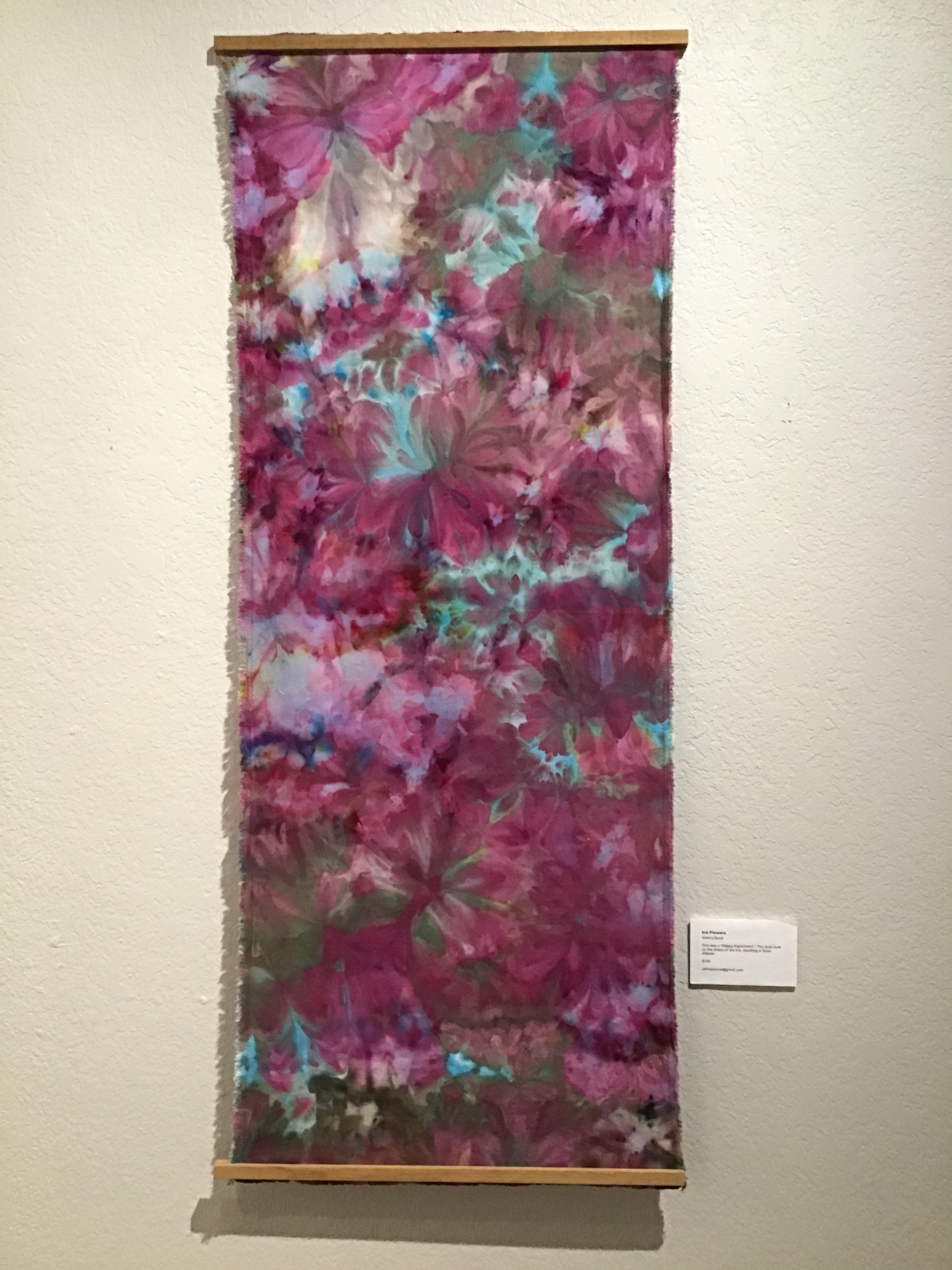 The work explores many surface design techniques – shibori and salt-dyeing in Sarah Newberg King’s silk ties, a “happy experiment” in accidental dyeing in Ice Flowers by Sherry Dorst, and batik by chance, Wesley Reed’s Nexus.