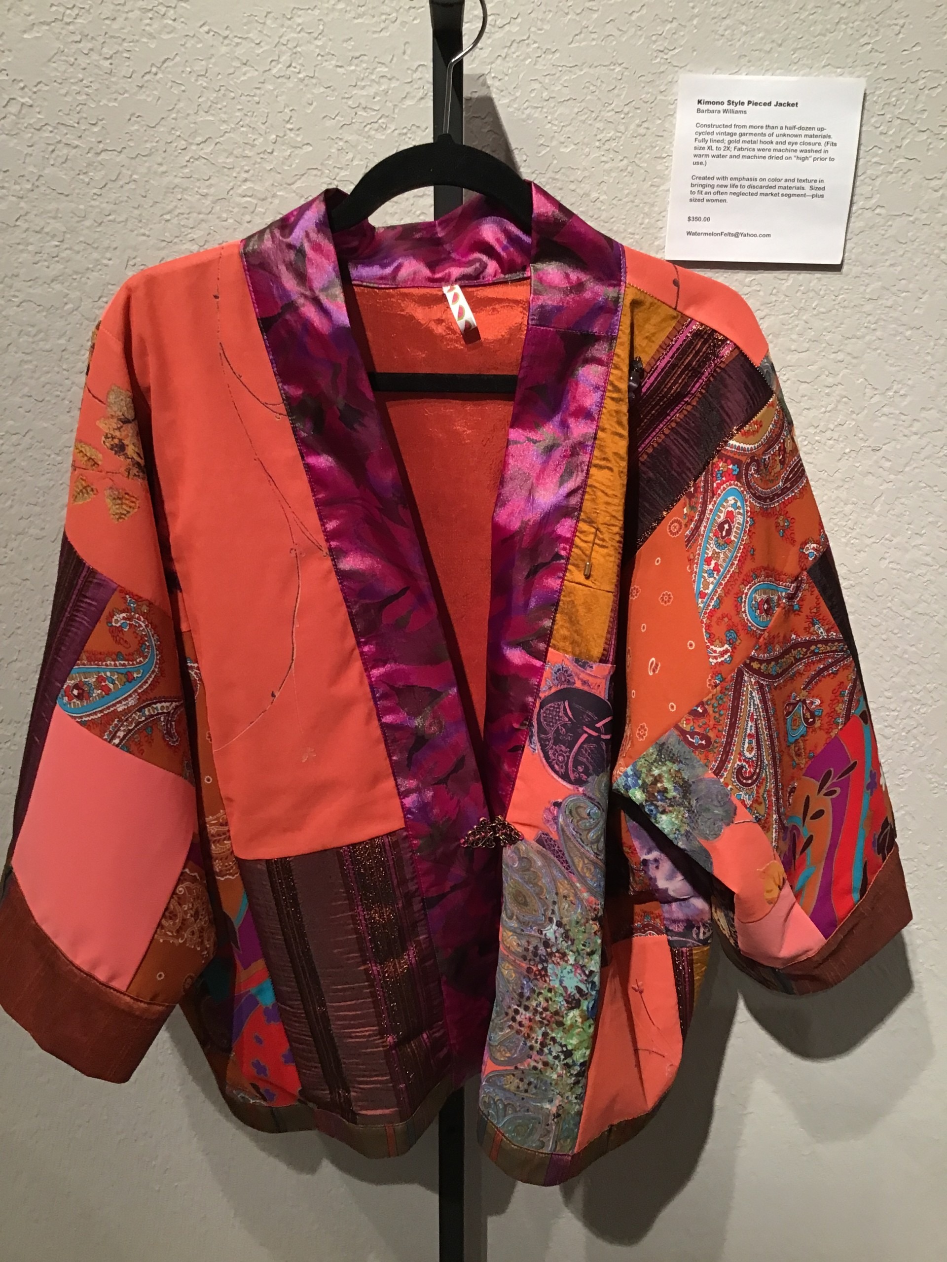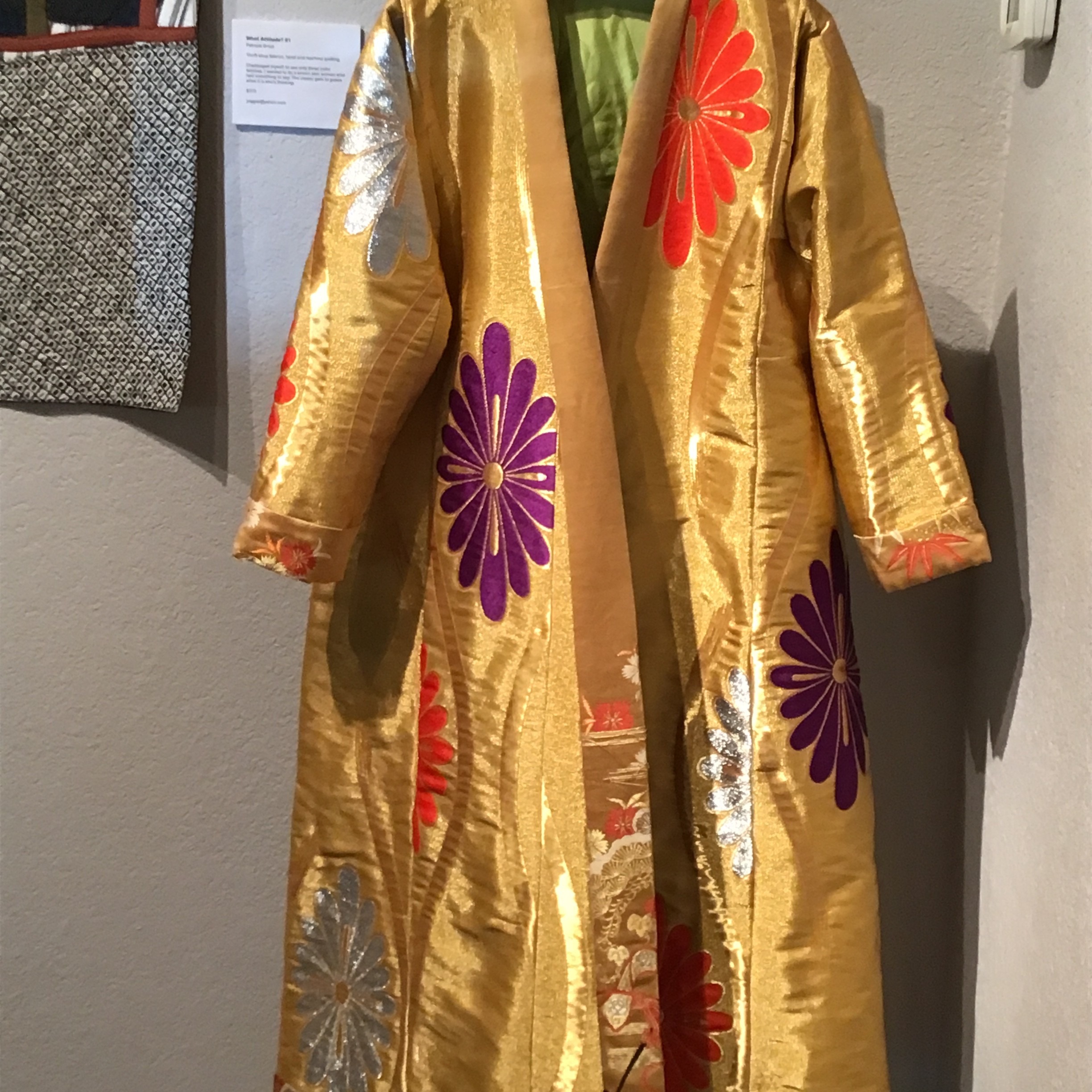 What would a fiber show be without functional, art-to-wear? Both pieces are outerwear. Barbara Williams used upcycled vintage garments and unknown materials for her pieced Kimono-style jacket. June Colburn created a Tatewaku (tah-tay-wahh-koo) Opera Coat out of vintage Japanese wedding kimono and silk satin brocaded obi fabrics. The Turkish coat is sewn from many narrow fabric panels.
