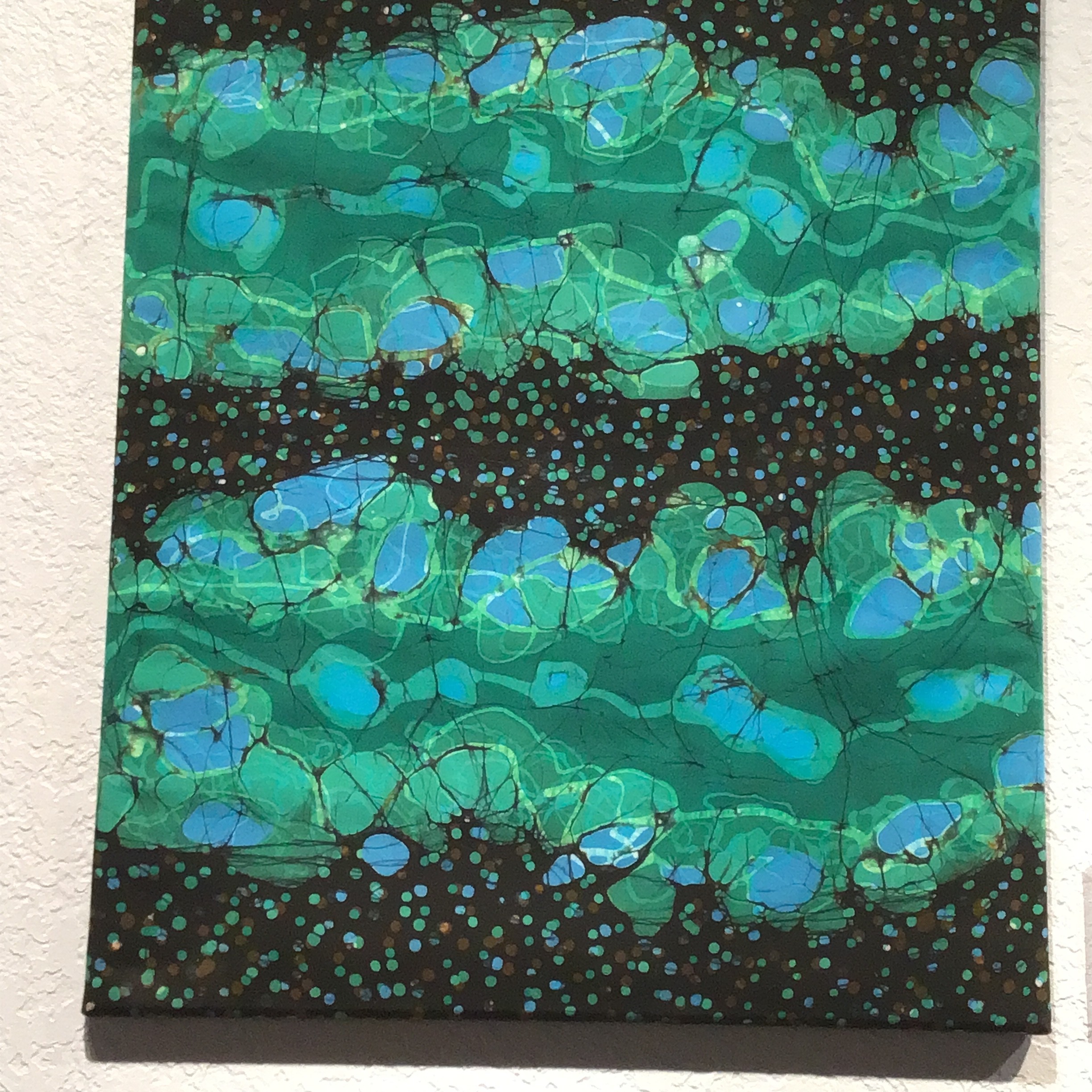 Reed, who has experimented in batiks for 50 years, decided to “let the wax and dyes do the creating and wait until I iron all the wax out to name them.” Nexus was displayed at the 2021 Florida State Fair and was among my favorite fiber works exhibited.