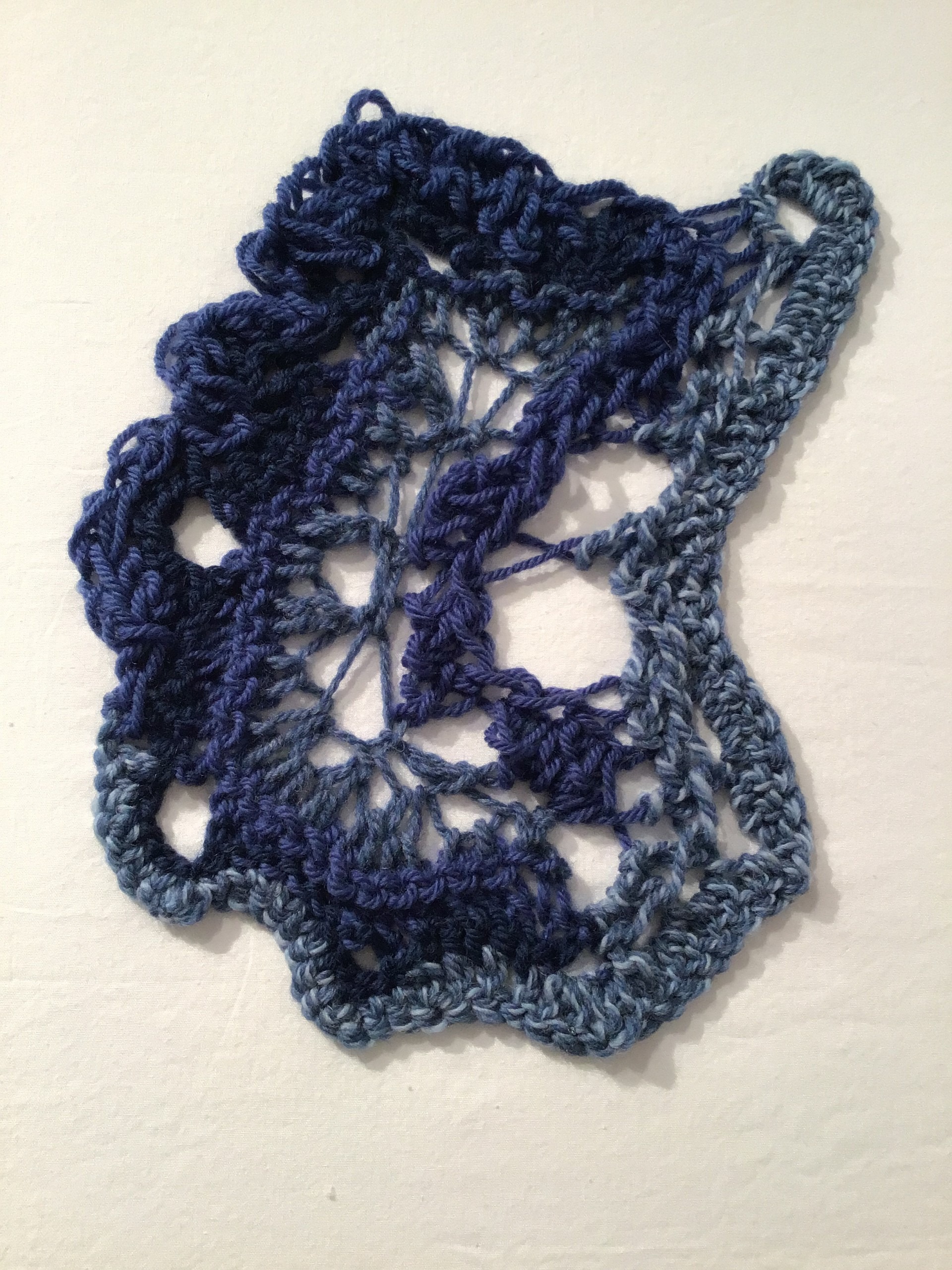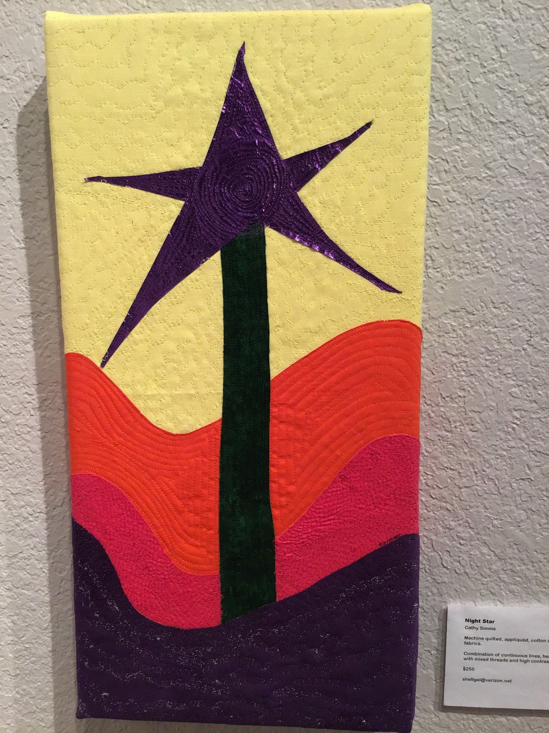 Cathy Simms machine quilted and appliquéd cotton and metallic fabrics for Night Star. Mei-Ling St. Leger’s Protozoa – Blue where she explored “space, texture and density in an unstructured environment” in knitting, crochet and looping was the sole yarn piece.