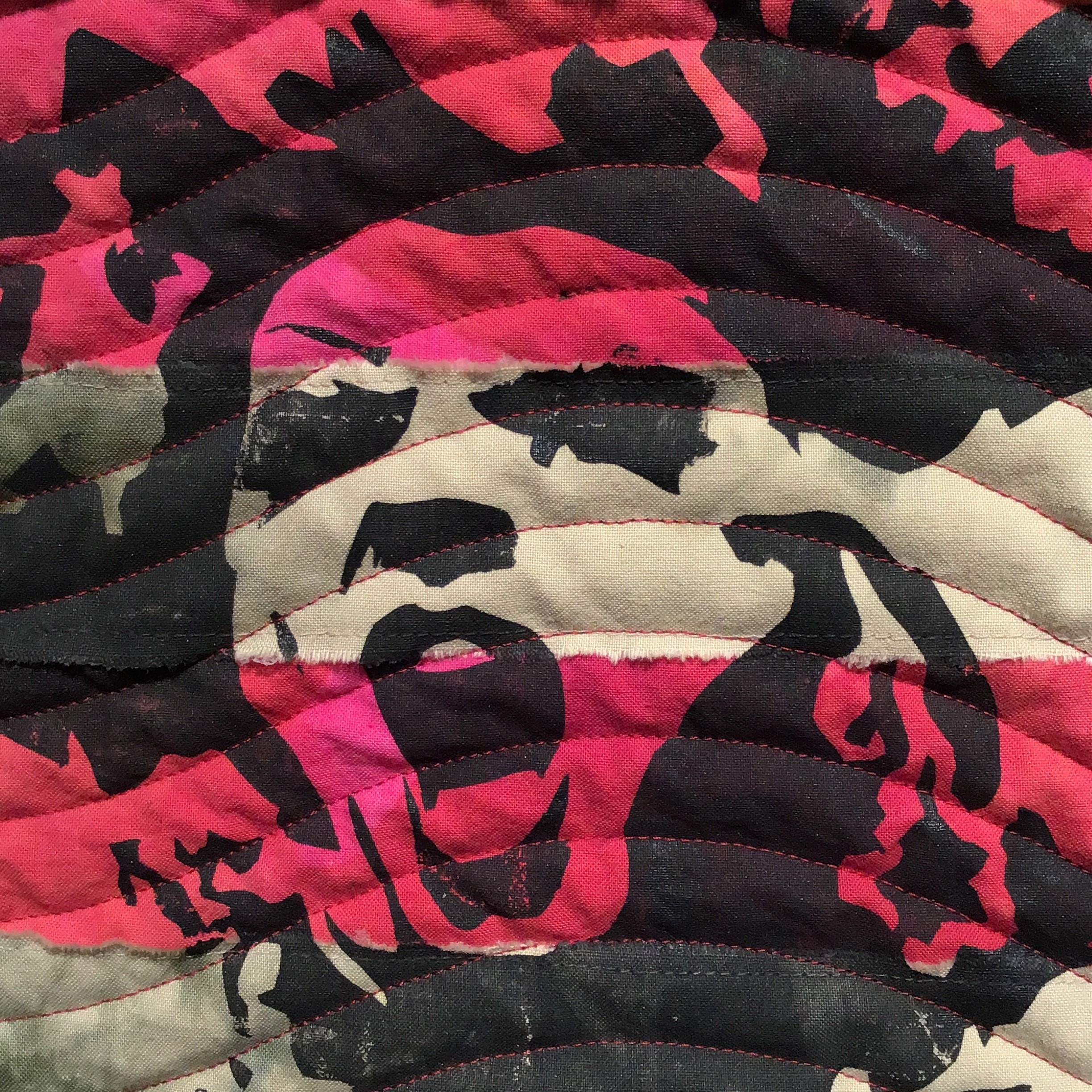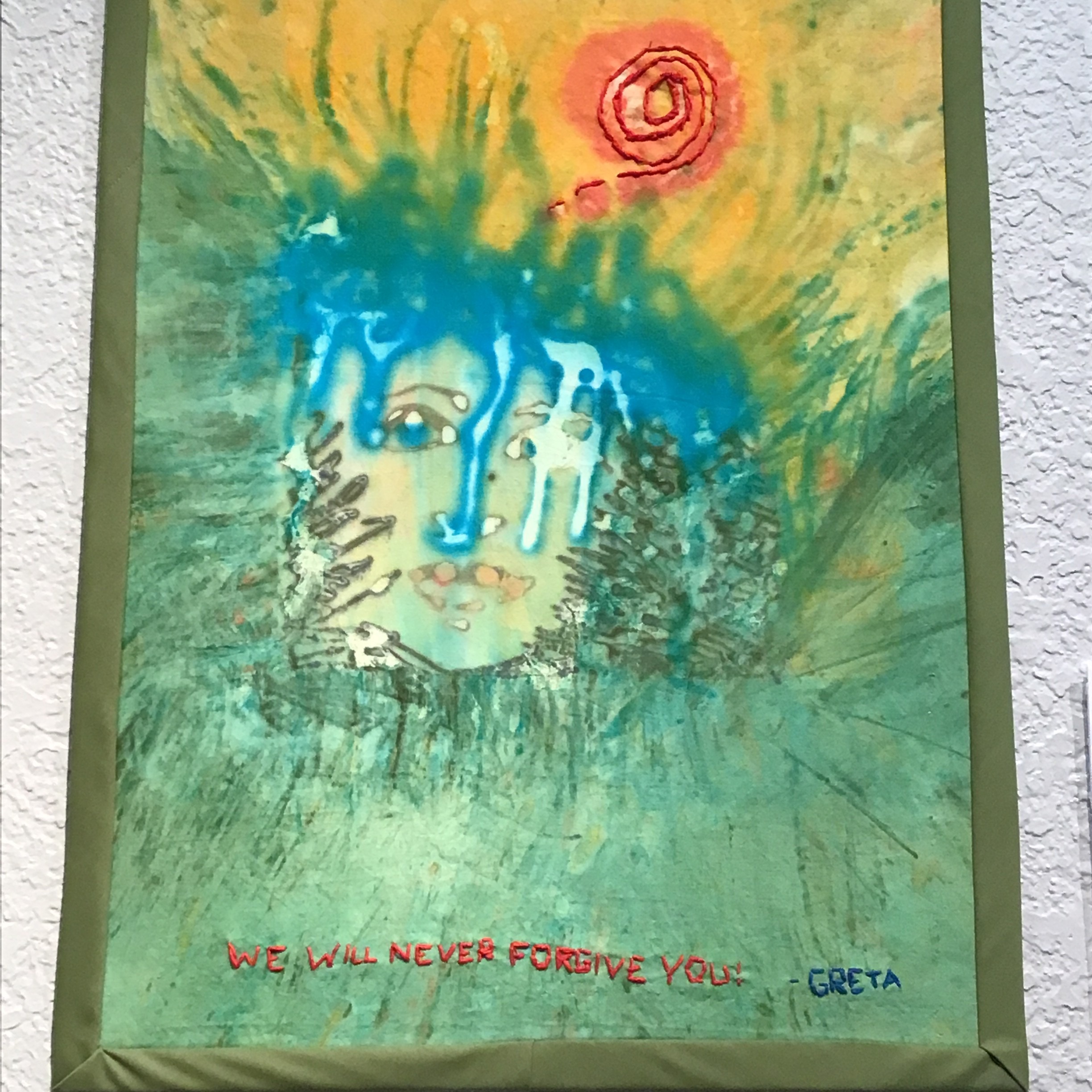 “I was profoundly moved by her commitment, knowledge and passion… I created the fiber piece with a breakdown screen printing technique in honor of Greta, and the embroidery as if children had written it.” A QR code on the identifying label will take you to Greta’s speech and transcript.