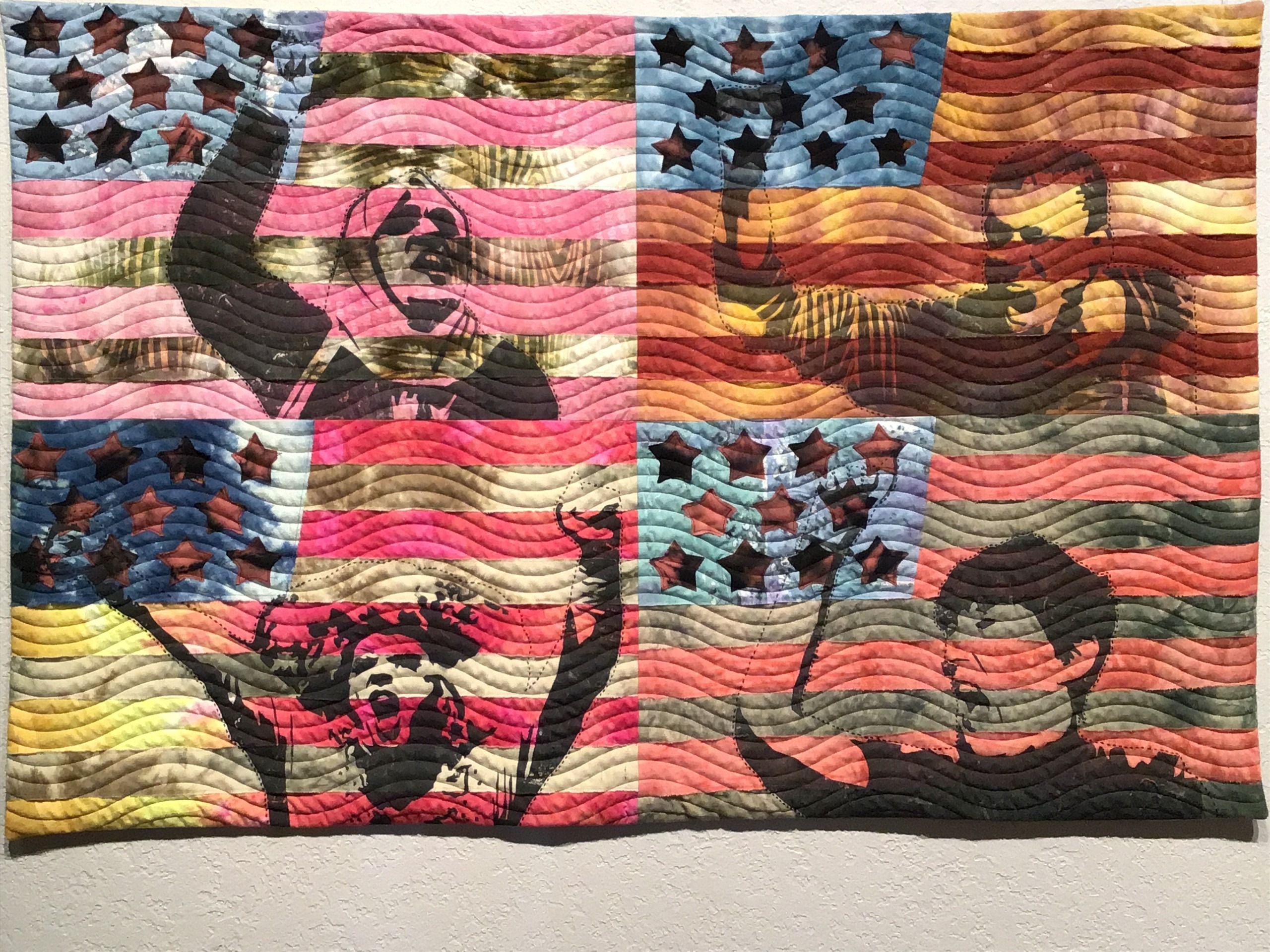 Neily’s mandala (silk dyed with Colorhue dyes, topstitched) is part of a series celebrating Florida mangroves. Lumsden’s piece brings to mind the cacophony of color and sounds from the creatures of Corkscrew Swamp in South Florida. “The sounds within the forest vary by the minute. Wood storks, limpkins, cicadas, pileated woodpeckers – they all make a ruckus,” she writes in her narrative.