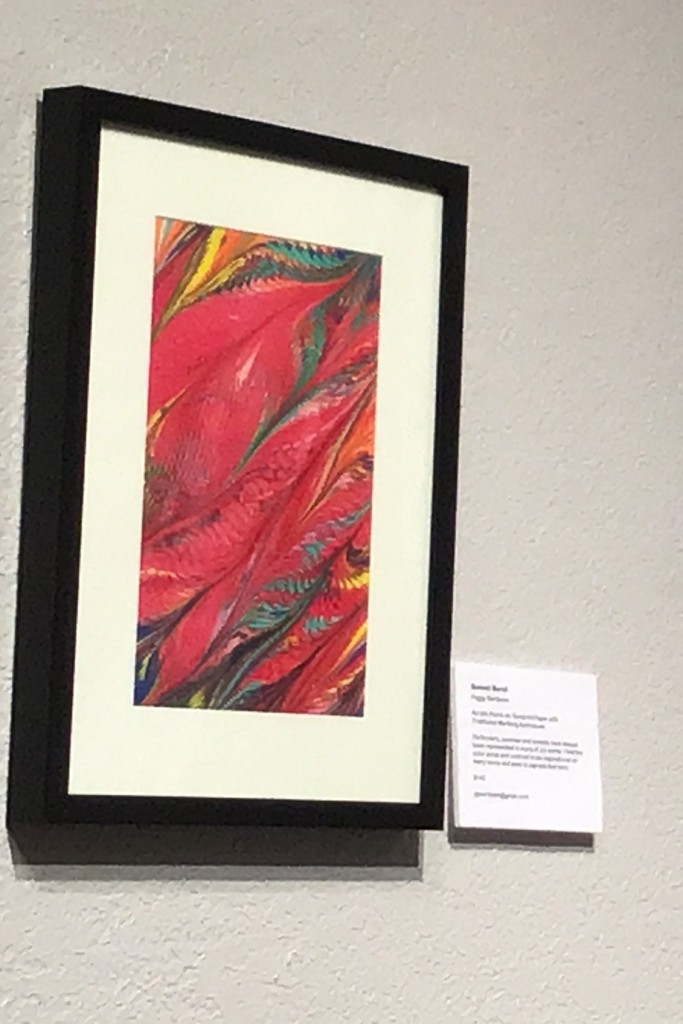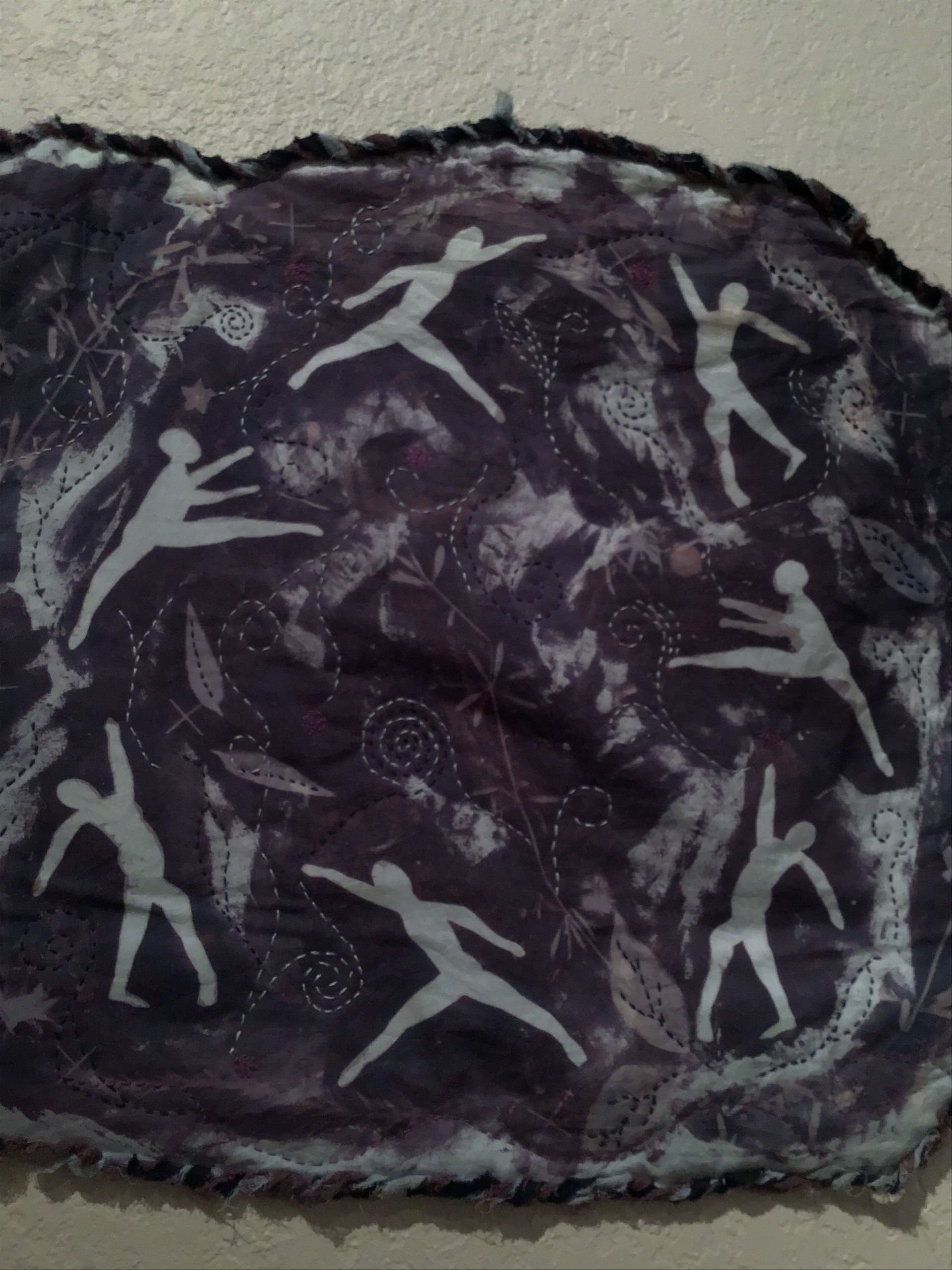 The touch and experimentation of fibers in a charming pretty-in-pink piece, A Field of Hearts by Patricia Toscano, provided her with endless joy. Peggy Wertheim, the only marbler in the group, used acrylic paints on Texoprint paper for Sunset Burst, while Dana Maley created an homage to Henri Matisse, The Sprites of Spring, in cyanotype (a photographic printing process that produces prints in a dark blue) with stencils, hand stitching and framed with hand dyed cheesecloth.