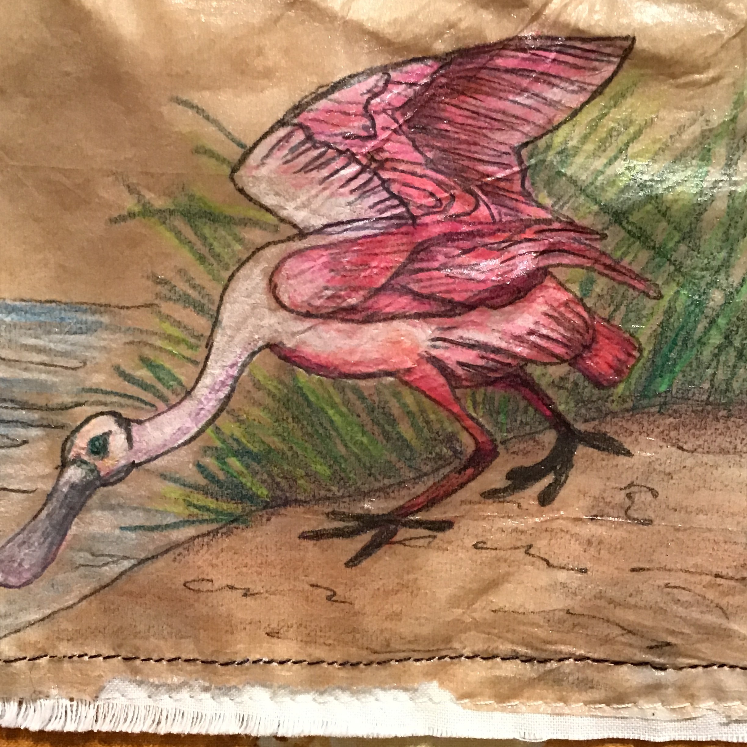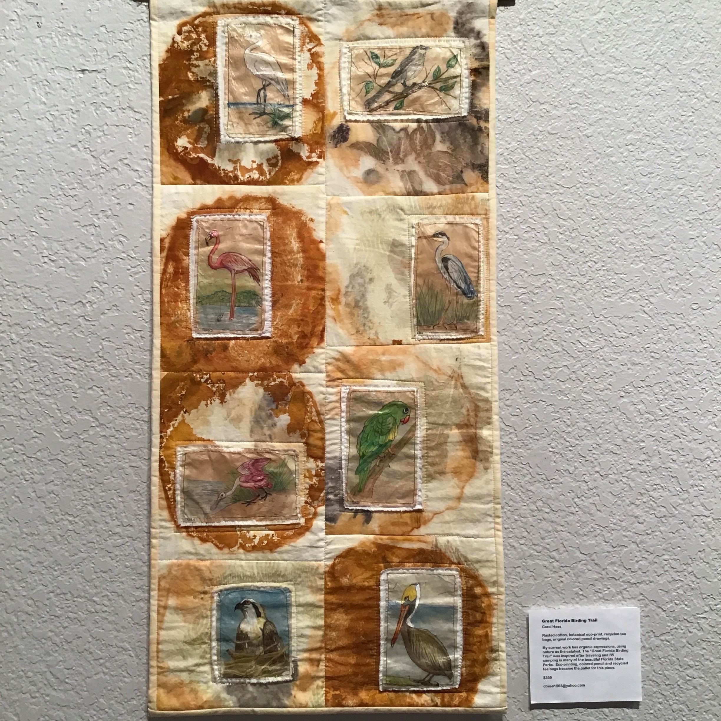 Hess (Birding Trail) was inspired after traveling and RV camping in many of Florida’s state parks. She rusted cotton and added botanical eco-prints, recycled tea bags and original color pencil drawings to create her wall piece.