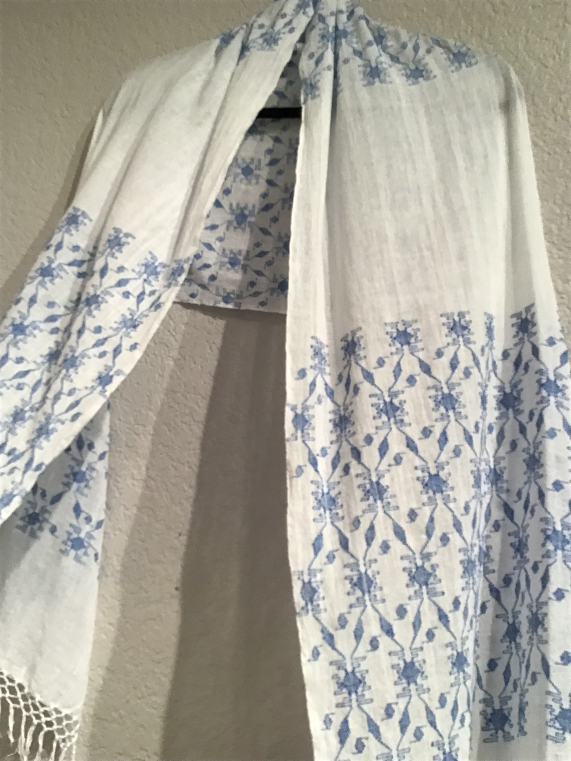 Concepcion Poou Coy Tharin’s White Shawl Blue Pattern is handwoven on a Mayan backstrap loom in “pik’bil” traditional style, a technique handed down through generations. The beauty and simplicity of the delicate blue on white design belie the painstaking work of carefully lifting each thread in the desired shape in weaving.