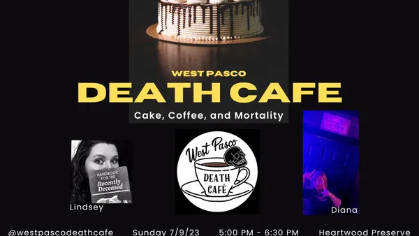 The North Pinellas Death Cafe meets at the Safety Harbor Art and Music Center (SHAMc). West Pasco Death Cafe meets at the Heartwood Preserve Cemetery (there is one scheduled for July 9). And if you can’t make it to an in-person Death Cafe, there’s the Northeast Florida and Beyond Virtual Death Cafe (enjoy your own tea and cake) which will meet next on July 5 via Zoom.
