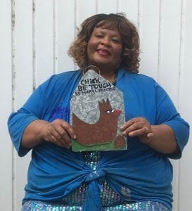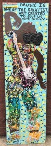 A prolific creator, some of Proctor’s work offers signature subjects — women, mostly in brown tones but some in peachy shades, with their heads thrown backwards as their arms lift to the sky — along with chickens and roosters, flowers, musical men and brightly-dressed women with red lipstick. Her beloved grandmother’s messages are painted into much of her work, along with Biblical lines, bits of popular culture mixed with old school wisdom and empowering language — all painted across her works in a large, playful scrawl.
