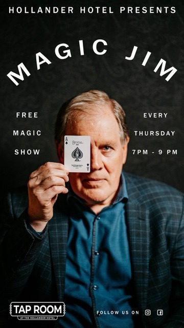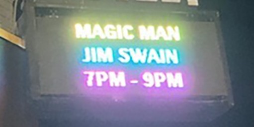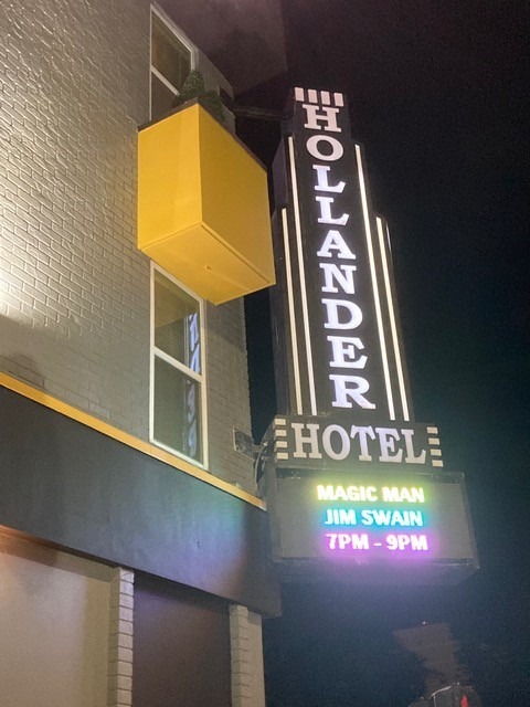 Swain is also a magician. For the past nine years (except during pandemic lockdown) he has driven from Odessa, where he lives with his wife Laura, to St. Petersburg to offers free magic shows a the Hollander Hotel on 4th Avenue N. You’ll find him there every Thursday from 7-9 pm – just look for the plaque that says Magic Jim on a table in the Tap Room.