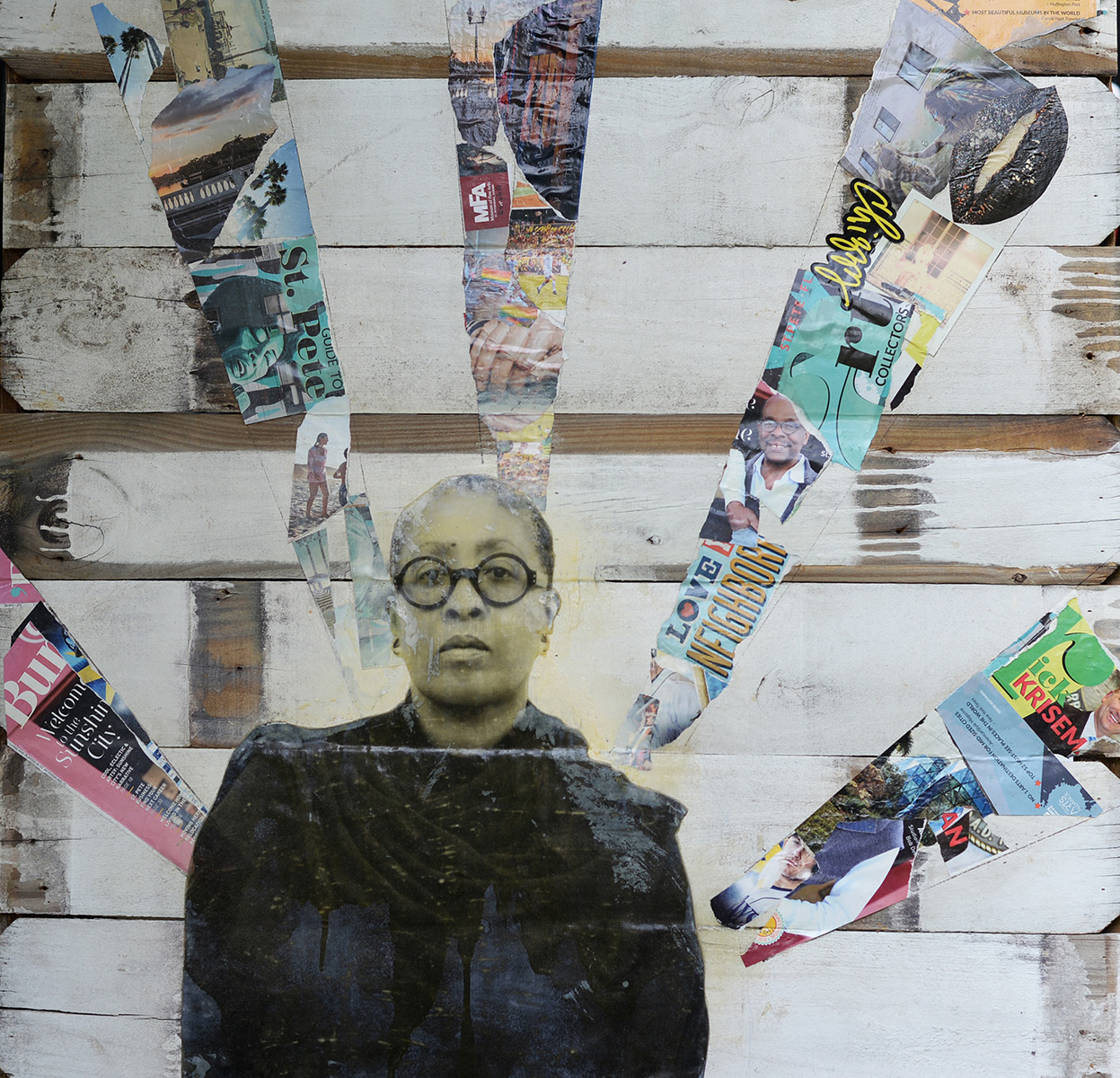 Portraiture became my primary form of photographic expression, and I fully dedicated myself to the practice of mixed media and building new techniques to use in that practice. I began layering paint with different types of papers, always with my photographs ink transferred onto a wood substrate. I’ve experimented with burned paper, used different types of leaves and barks, and all manner of magazine, newspaper and book clippings. With mixed media, there is no limit to what you can use. Look around you, what do you see? Mixed media materials galore!