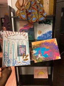Among the books and artwork on display at the pop-up store are paintings and collages kids produced after reading a book. Thanks to the bookstore’s unique program, The Book Report Project (see details in sidebar), kids read a book and then create a book report in any form – from an essay to a piece of art to a podcast – which they can exchange for another book.