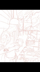 The developing stages for this series of portrait paintings on which I’m currently working begins with an interview process. First is a recorded interview. This is really just for personal use to help me create a portrait that involves imagery that reflects this person and, to a degree, who they are beyond external attributes. Some of the questions I might ask are, “Who did they most admire growing up? What’s your top five musical artists? How old do you feel?” Yeah, these are kind of basic questions, but they really lead up to the spontaneous questions that arrive through simply talking. That’s really where you get a better feel for an individual. This allows me to come to an idea of what I want to portray. Next, I’ll take reference shots of the person I’m interviewing and then sort through them in order to find the image that is most representational of that person. This is the skeleton of the piece from which I can build a composition around. Then, listening back to the interview as I draw on a piece of paper, I try to work out and sort the imagery from the interview to be able to combine it with the photo reference. I’ll take it into a digital format like Photoshop or Procreate and play with it there, which allows me to readjust things, without having to redraw them. I’ll also sometimes collage photos in there. I print the image back off to draw on top of it. This time is a seesaw, going back and forth from drawing from hand to digital until I get the reference that I want. Arriving at a sketch for the beginning stages of a painting.