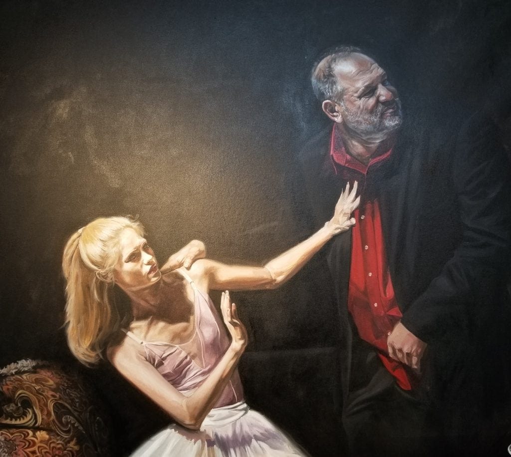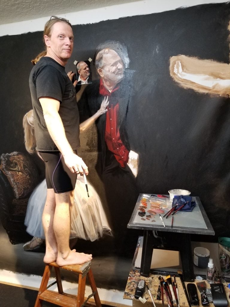 Florida artist Kevin Grass roughing-in the head of Harvey Weinstein in his large Not #MeToo: No More Casting Couch painting