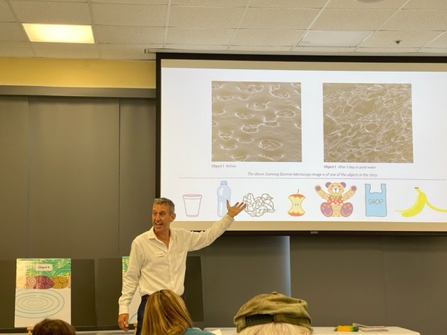 The kids had to guess what objects were the subject of the magnified photos. The photos were magnifications of the littered items before they were in the pond and after three days left in the pond. They saw how the water changed the litter.
