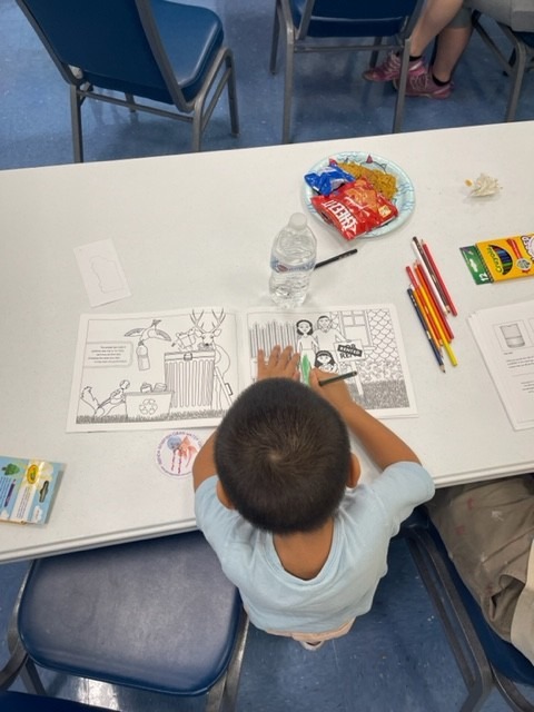 I wish everyone could have seen the impact of the Scanning Electron Microscopy (SEM) photos on the children’s faces as they colored with their free coloring pencils in their free coloring books. The 10,000+ magnification photos were of plastics, styrofoam and litter dropped in the pond in the story.