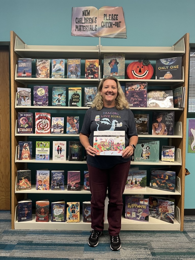 Safety Harbor Public Library – Librarian Anastasia Underwood with a copy of There’s A Crystal Clear Pond, the book written and illustrated by Pamela J. Trow