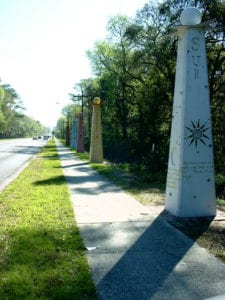Year after year, Veterans create an anti-war installation of tombstones along The Solar Walk on Memorial Day. Iconic art critic, Suzi Gablik, notes of this phenomenon, “The joint installation of the Solar Walk, with it’s cosmology going down one side of the road and the tombstones running side by side near it, needs no interpretation. Like a haiku flash, one is very quickly drawn into the terribleness and grief of war.” (Ironically, Gainesville city officials tried to shut down the installation at the height of war in 2007-2008).