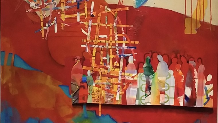 I define myself as an intuitive painter, which is a method of creating art that aims to explore and uncover aspects of the inner self. It’s the practice of freeing your creativity. As I started the series I had no idea what it was about. There was something emerging from my inner being onto the canvas. I’ve been experimenting a little with different ways to depict the human form, in this piece I used the head and body. My mentor discouraged me from using them the way they were laid out. Soon after, I attended an art show at Temple Beth El. As I was getting ready to leave the synagogue a display of pottery drew my attention. It was a cluster of human forms shaped like the ones I was working with. I almost blurted out loud, “You want to be in my art.” In my studio I gathered the figures together muttering “Denis, I respect your opinion but these must stay.”