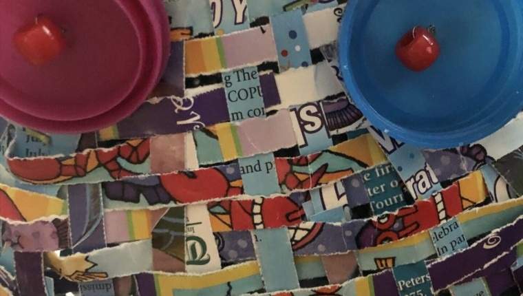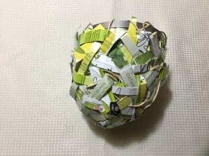 Turns out I have something in common. American Artist Tara Donovan uses everyday materials that “are easily accessible, inexpensive and mass-produced.” I choose my weaving materials for the same reasons. Printed paper, more specifically “expired” business rack cards, brochures, holiday and birthday cards destined for the trash can!