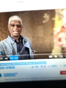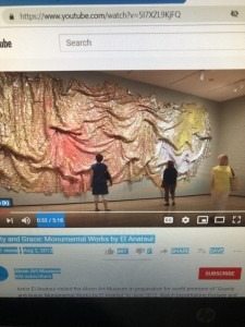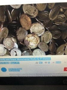 The other video, “El Anatsui: Studio Process/Art21 Extended Play,” followed the internationally acclaimed Nigerian contemporary artist. Coincidentally, I saw his bottle cap art two summers ago on exhibit at the Princeton University Museum of Art. How, I wondered, did he create his huge wall hangings made of bottle caps?