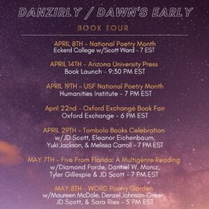 When I was drafting the poems of Danzirly, I could not fathom having a digital book tour. Unprecedented times required all of us to adapt in all kinds of ways – we stayed home, we picked up groceries, we washed, we worried, we mourned, we disinfected, and we masked (still masking over here, by the way. (Get vaccinated!)).