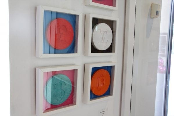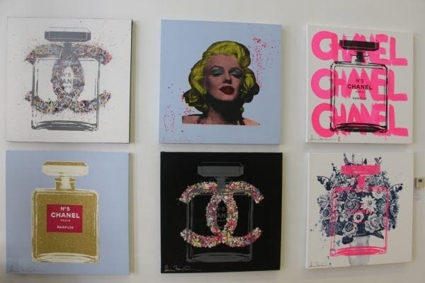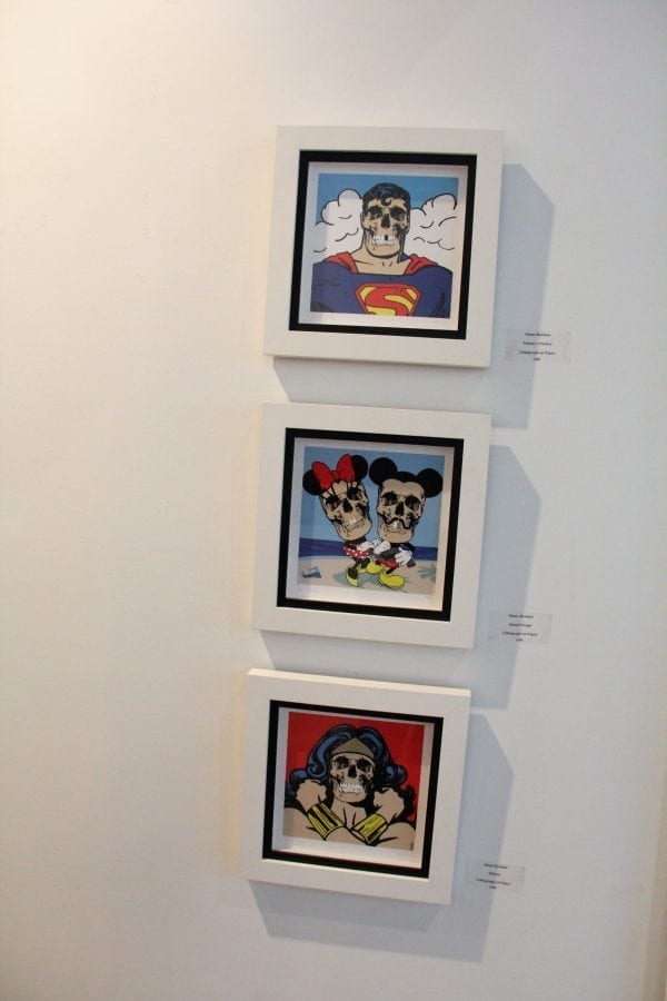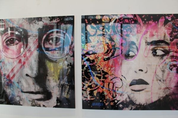 Libertine’s permanent, rotating collection includes Australian artist Shane Bowden, whose works call into question our ideas around entertainment, pleasure, fashion and consumerism, mixing elements of shock and humor with familiar logos, imagery and icons, both illustrated and human. His imagery encompasses graffiti, figure realism, abstract expressionism, and black-and-white print in an array of media. He claims Warhol, Rauschenberg, Damien Hirst as his major influences, and uses humor and levity to help us deal with life’s frustrations.