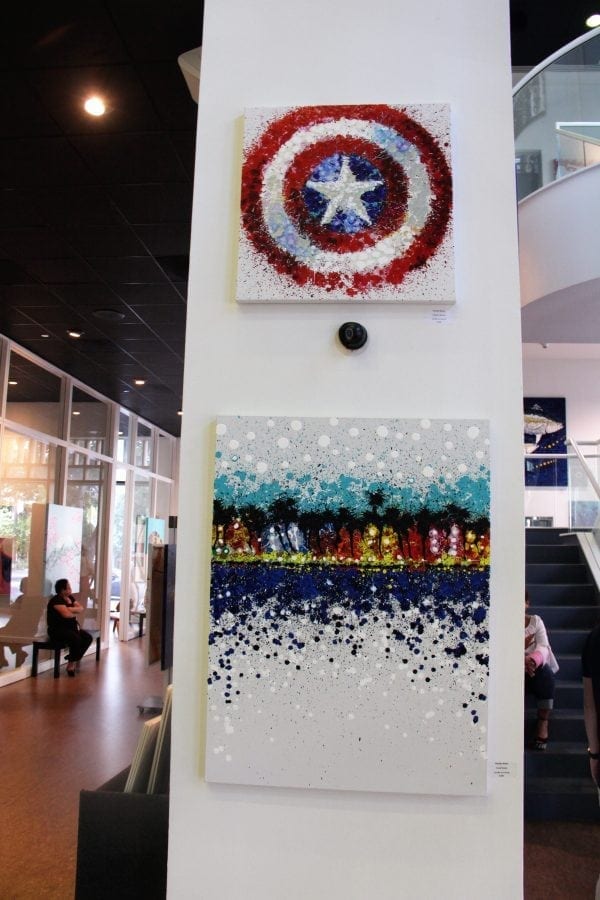 Gallery Manager Ari Robinson, a Creative Pinellas 2018 Emerging Artist, has works in the collection, works from her dreamy Luna series. For the works, she collages hand-painted snippets of abstract waves and other shapes in a circular shape that resembles a photograph of the the moon’s surface, but if you stare up close, mysterious details emerge, adding new perspectives. Eye-catching for sure, Robinson’s work is getting attention locally and internationally. Along with being chosen for MIZE gallery’s “Fruit Bowl” exhibition next month, her work also appears on Les Vins Georges Duboeuf’s 2017 Beaujolais Nouveau label.