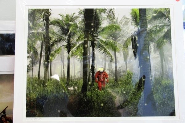 There’s also the visceral, hyper-kinetic abstracts and pop icon works of Timothy Raines and Jay Johansen‘s striking figurative realism. London artist Zeus cleverly calls attention to corporate intrusions on our health and everyday lives with his colorful pills. Jason Brueck, one of my personal favorites, is an emerging digital artist from Fort Myers, who now calls East Nashville home. His photographic manipulations are otherworldly, a bit tweaked and often downright chilling. Be sure to check out his “Alter Images” series, which juxtaposes a feeling of being outer space and scenes of Old Florida. One of the standouts, Guiding Light, depicts an astronaut wandering through a Florida landscape as fireflies sparkle around him like stars. I couldn’t stop looking at it.