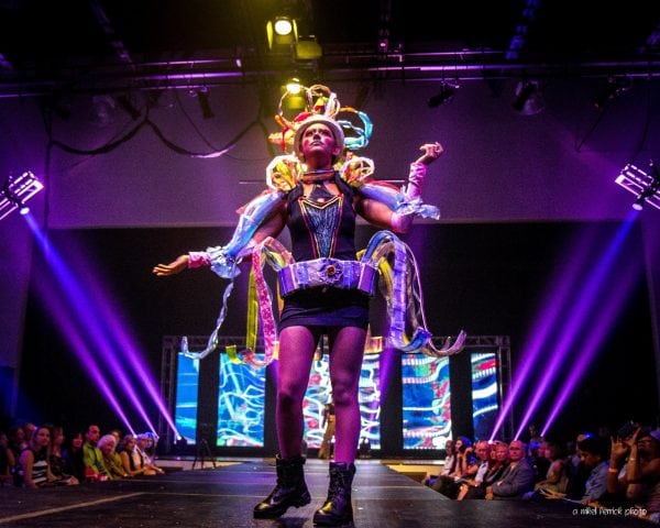 Dacota Maphis informed her collection Urban Play with her love of city life and its the relentless variety and energy. Maphis takes a satirical look at corporate, office settings, likening the power structures to those the kings, queens and others in the royal court. Soldiers represent authoritative figures. Here Jester Delis Silva wears styles of the past and present.