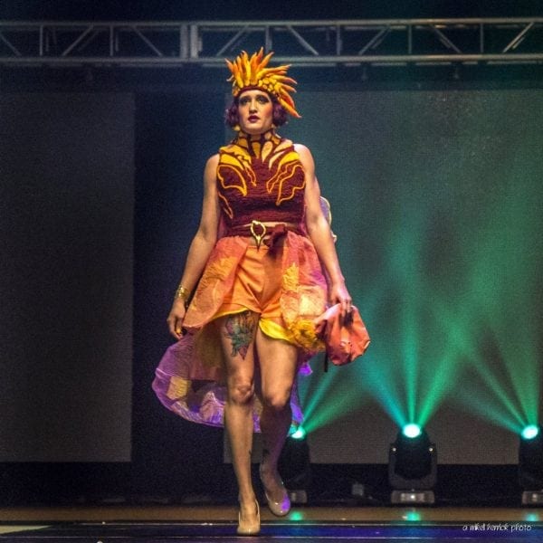 Model Candace Tillman, decked out as a lionfish, walked the runway in Johnson Hunt’s show. A former Sunshine State resident and FSU alum, Hunt now lives in and teaches visual arts in Michigan. The designer’s collection for 2018 reflects her vision of Florida’s evolving flora and fauna and how nature and landscapes adapt to the impact of humans and a changing ecosystem. With an awareness of the relationship between the fashion industry and waste, Hunt constructed her pieces out of recycled garments, textiles and plastics.