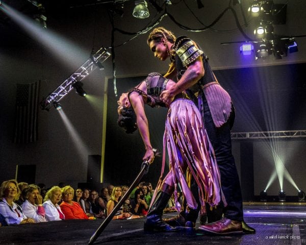 With the ambitious theme The Evolution of Fashion, Lina Teixeira traces the history of couture from caveman days to the future with 22 models. Here, models Tyler Rupe and Amanda Villanova represent the Vikings-era; skirt constructed with belts.