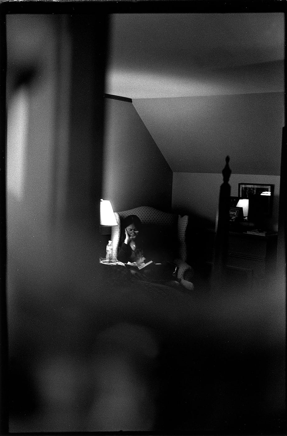 I was about to brush my teeth in the two-sided mirror attached to the bathroom wall when I saw this backward reflected image: the bright lamp, Merla’s face, the old colonial furniture, the geometric shapes of the walls and ceilings. All of it framed by the out-of-focus bathroom door frame at my back. I grabbed the Leica and shot. It was a rare moment – she never knew I took the photo. This image became a sweet memory of the peace we had reading in that room each evening. Photos expand the storage capacity of our brains. A single photo of a single moment – for better or worse – opens a multitude of memories.