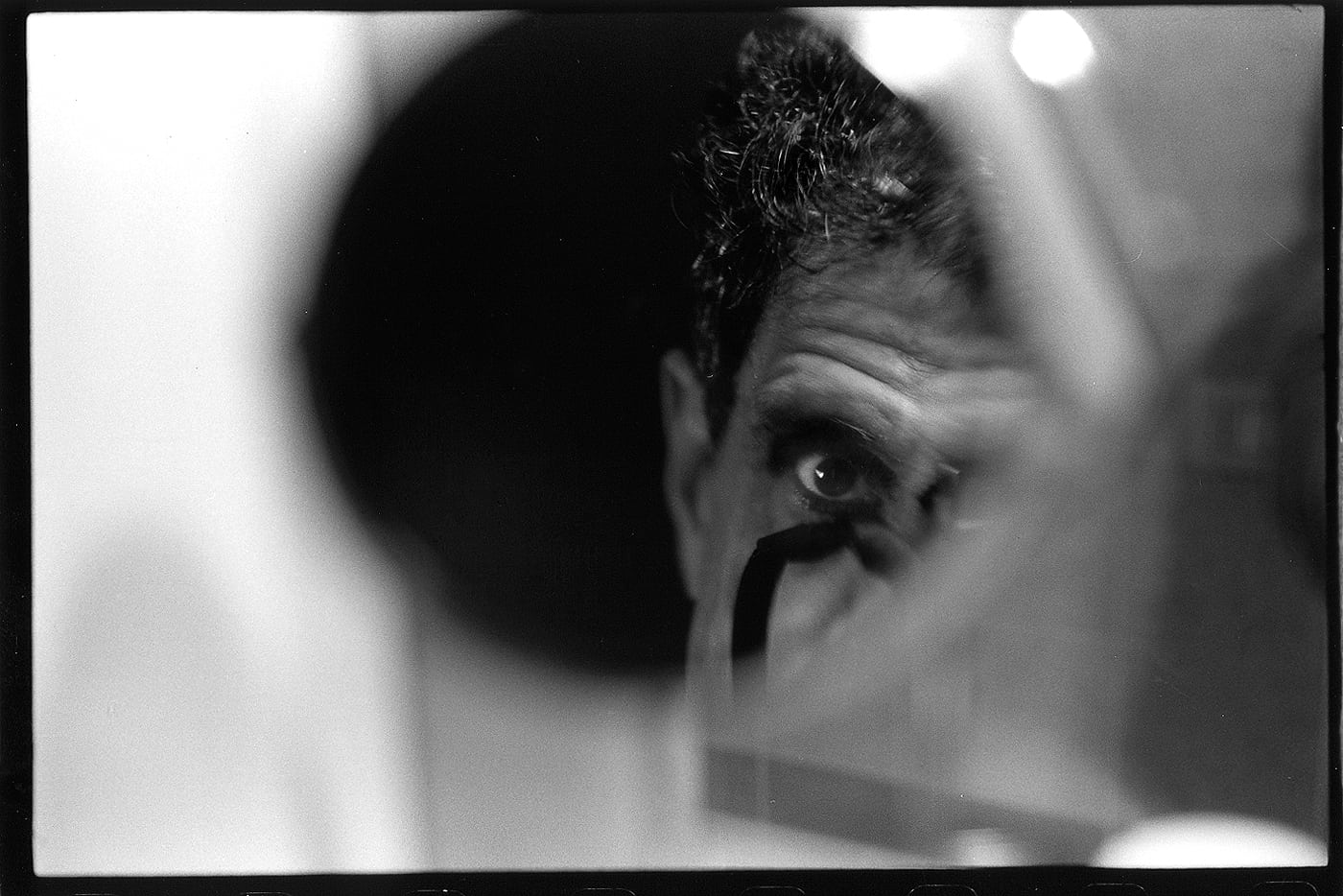 What a contrast when I flipped the mirror over and made a self portrait using the close-up, concave side of the mirror. With facial features enlarged, the image depicts an intense, almost frightening, voyeuristic-like eyeball preying upon its victim. Photographing people can be both an aggressive and intrusive action.