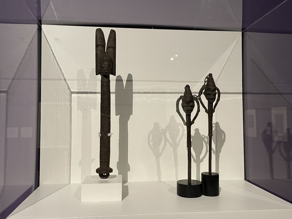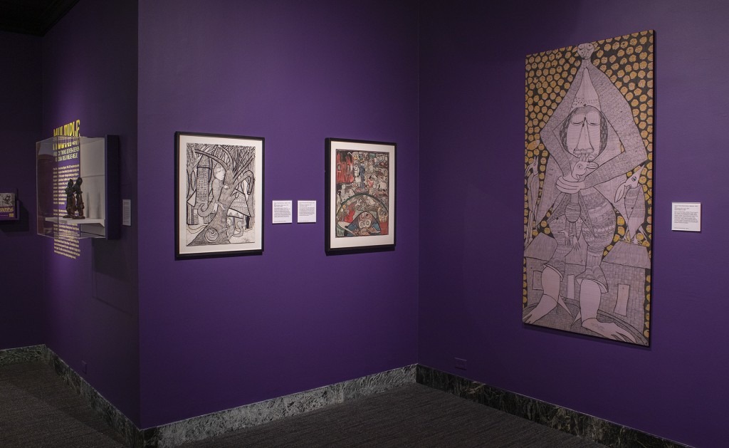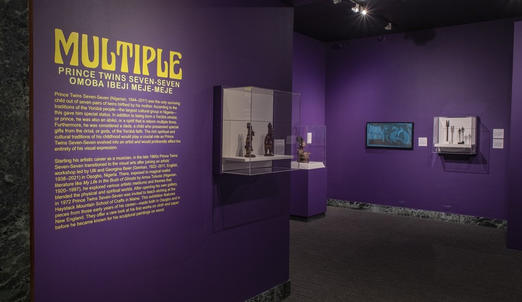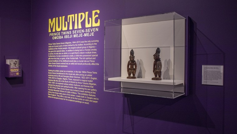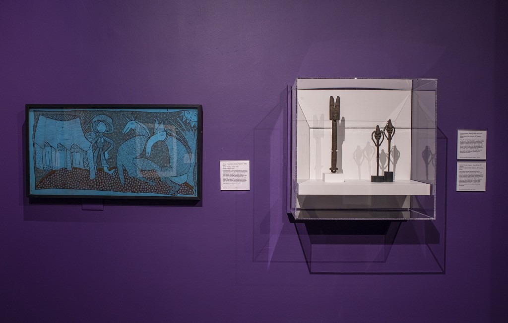 Hill-Thomas designed the “royal” space that I perceived as a brightly colored purple jewelry box accented in yellow to display 14 special pieces – 10 works on paper or cloth by Prince Twins Seven-Seven and four other Yorúbà sculptures from MFA’s collection.
