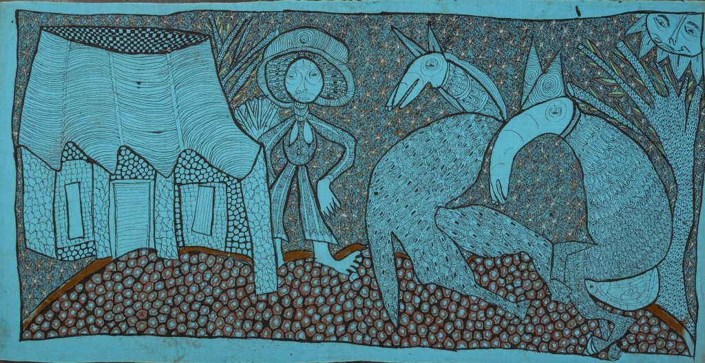 The artist often painted scenes connected to the spiritual otherworld. Here, we see an airplane, motorcycle and a car…and many beings. Prince Twins Seven-Seven said he would draw his cultural beliefs. At the same time, he didn’t want to paint “what was existing in our [world].”